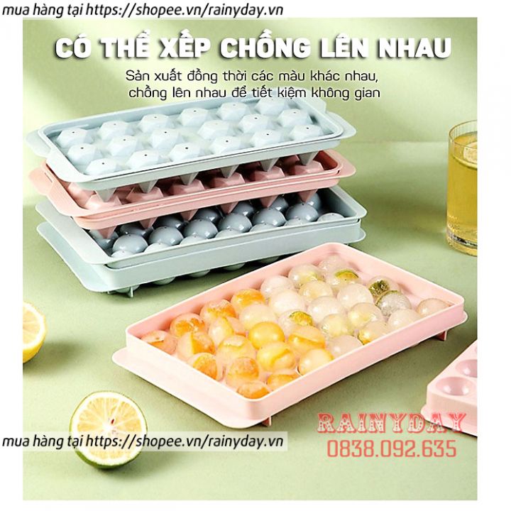 Khay đá tủ lạnh khuôn làm đá viên thạch bị rau câu hình tròn 33 ô có nắp đậy bằng nhựa