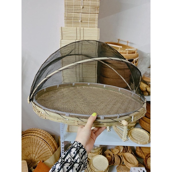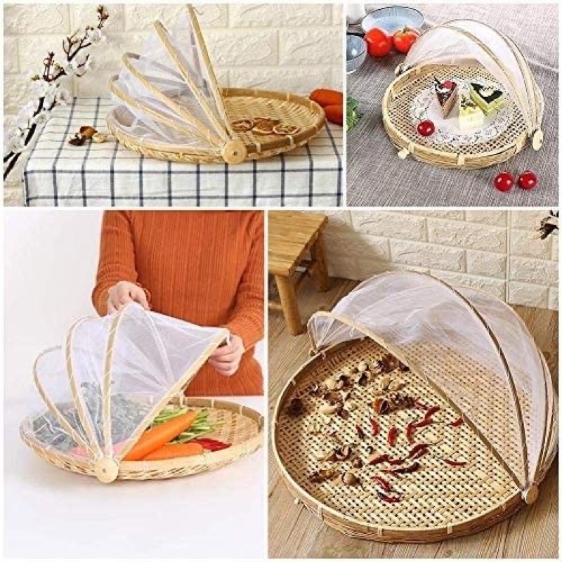 Giới thiệu Khay đậy thức ăn bằng tre tự nhiên, có màn che bụi, lồng bàn đựng thức ăn, đồ dùng gia đình, chống ruồi, muỗi, chống bọ