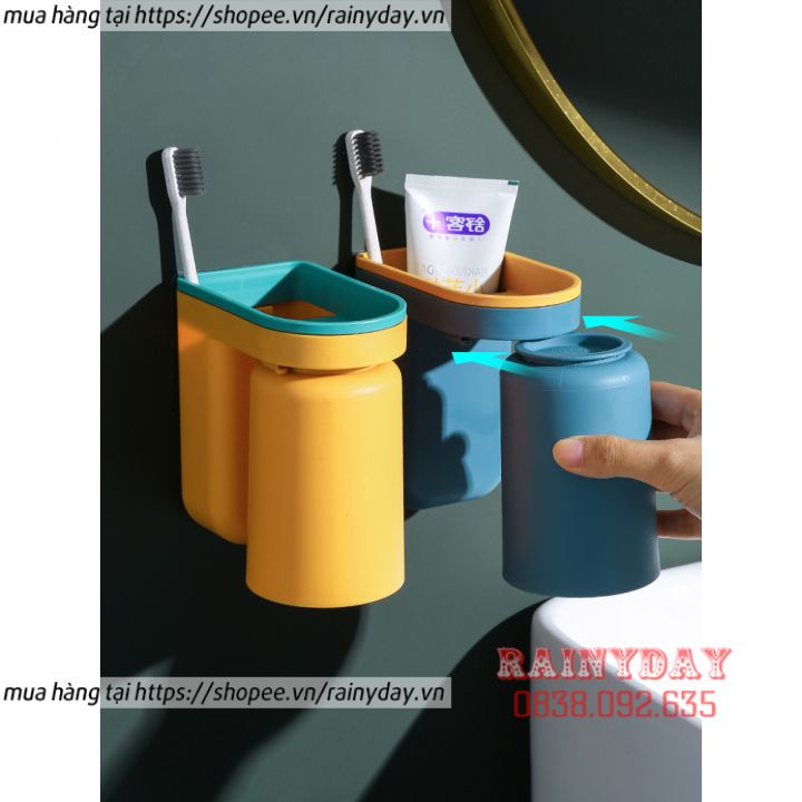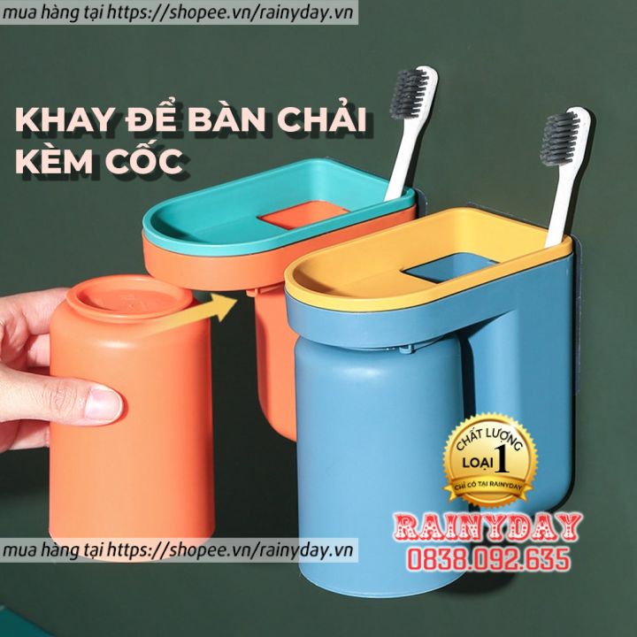 Khay để bàn chải đánh răng kèm cốc dán tường nhà tắm, kệ giá đựng bàn chải đánh răng dính treo tường