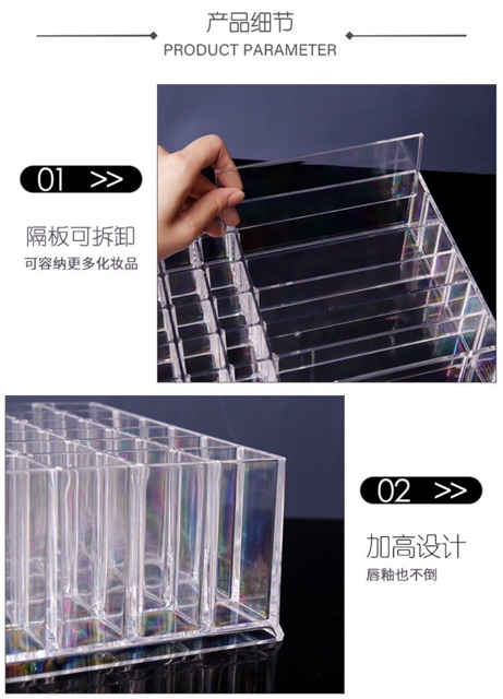 - Khay còn dc chia làm 18 ô để son, kích thước mỗi ô 3 x 3 cm