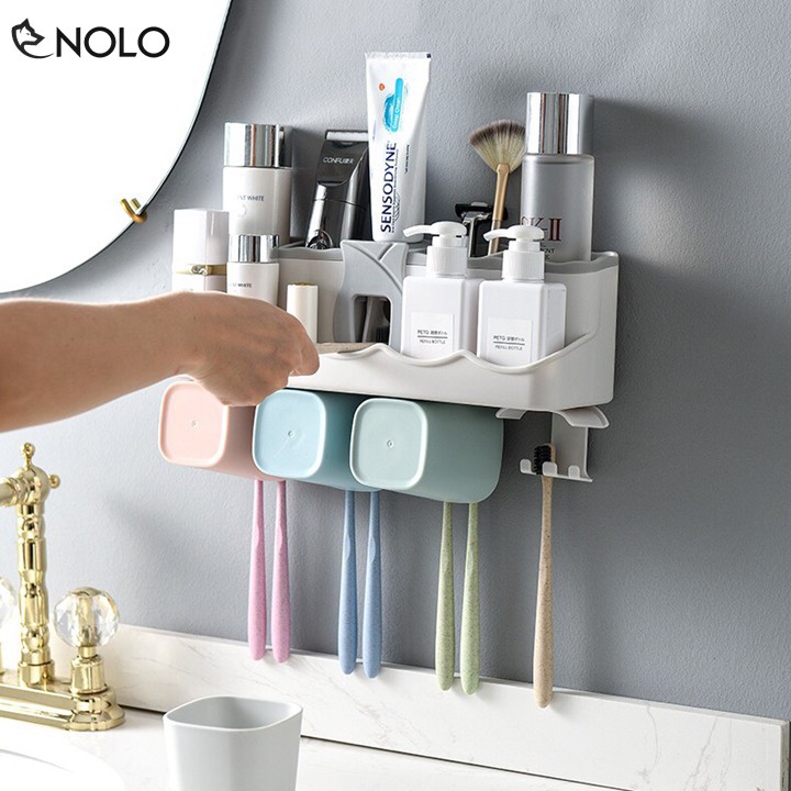 Bộ Khay Đựng Bàn Chải Kem Đánh Răng Vật Dụng Dán Tường Siêu Chắc Kèm 4 Cốc Chất Liệu Nhựa PP Nhựa Lúa Mạch