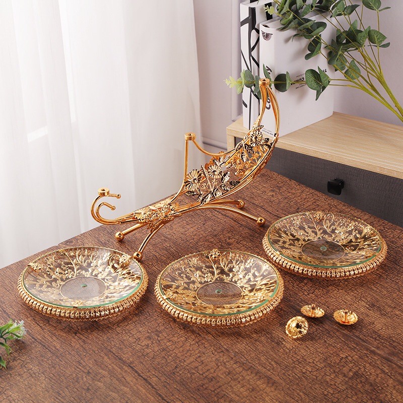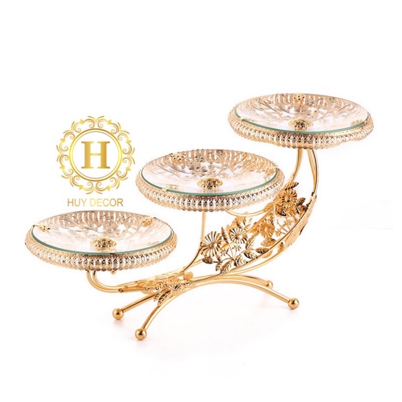 Khay đựng hoa quả hình thuyền đĩa tròn hoa văn dầy đẹp sang trọng phục vụ phòng khách ngày tết , bánh kẹo trang trí bàn tiệc , bàn ăn , bày trang trí tủ kệ phòng khách cực sang chảnh nhé . Khay gồm 3 khay làm bằng thuỷ tinh cao cấp dầy dặn trong suốt và kệ đỡ hình chiếc thuyền cách điệu được mạ vàng bằng công nghệ pvd 5 năm chưa xuống mầu . Có hộp đựng bảo quản khi không dùng đến nhékích thước đĩa ~17cm , chiều dài tổng thể ~35cm , cao ~20cm