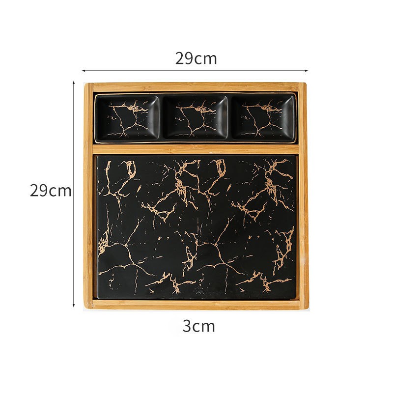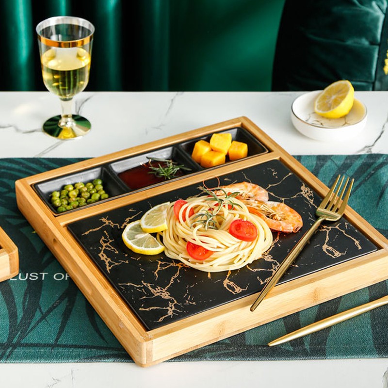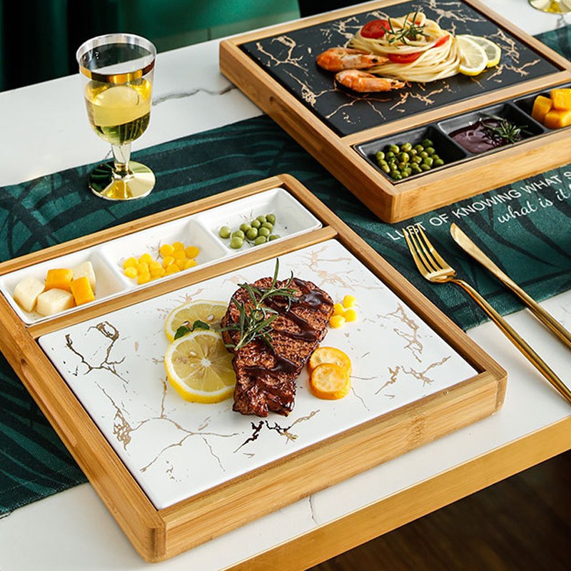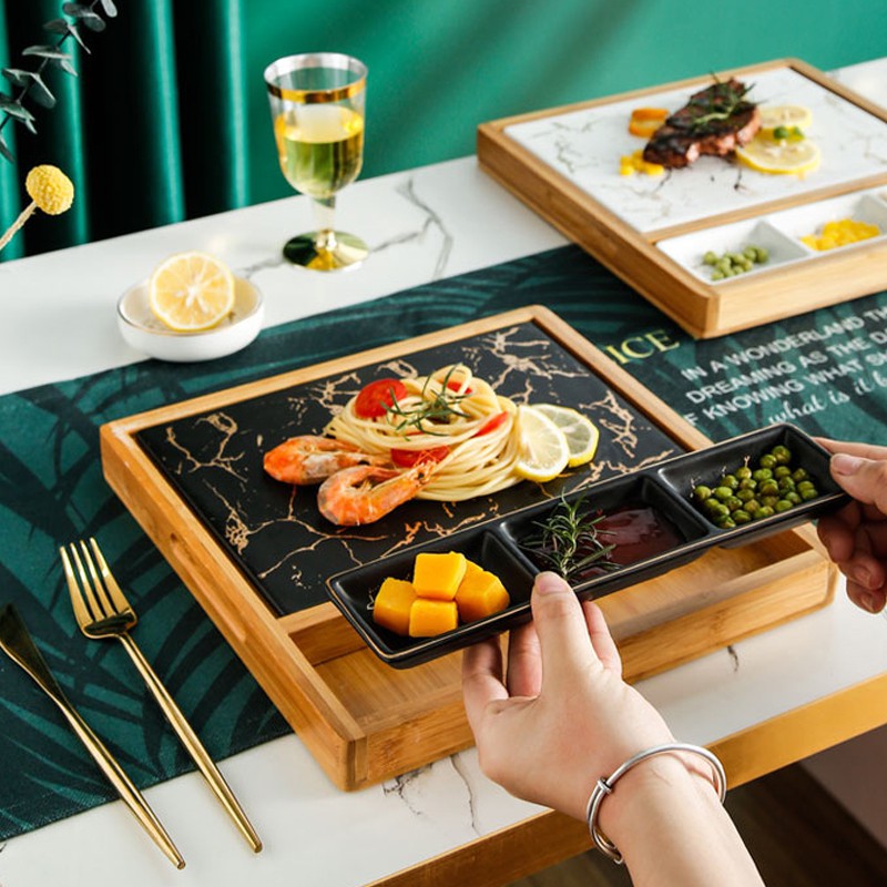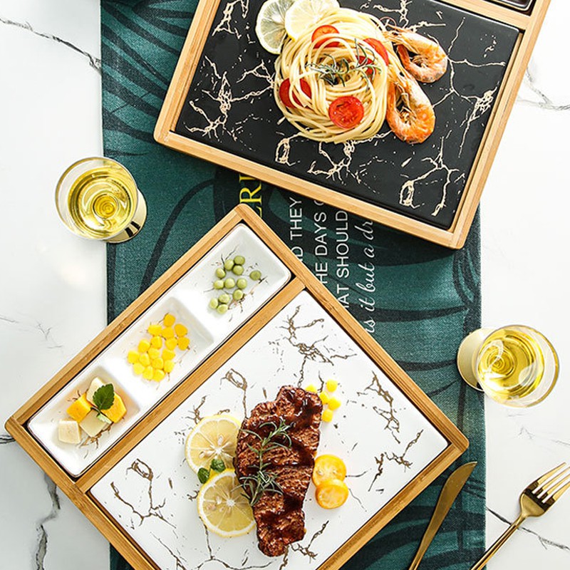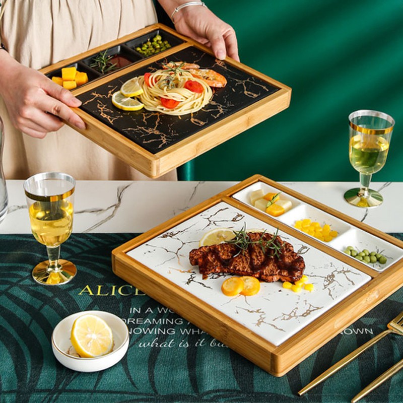 Nhà cửa & Đời sống > Bộ đồ bàn ăn > Khay, tấm lót bàn ăn || Khay đựng đồ ăn vân đá Marble kèm đế gỗ phong cách Bắc Âu - Jassi DecorCòn hàng