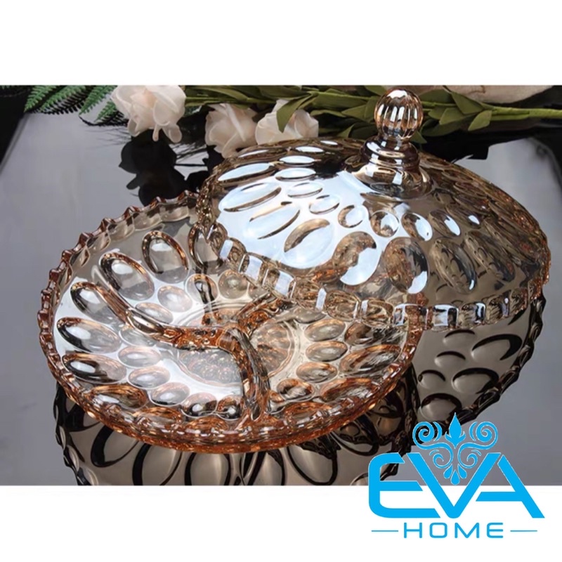 - Kiểu dáng : Khay thủy tinh đựng mứt, bánh kẹo ngày Tết có 3 ngăn và có nắp đậy được thiết kế khéo léo, đẹp mắt.