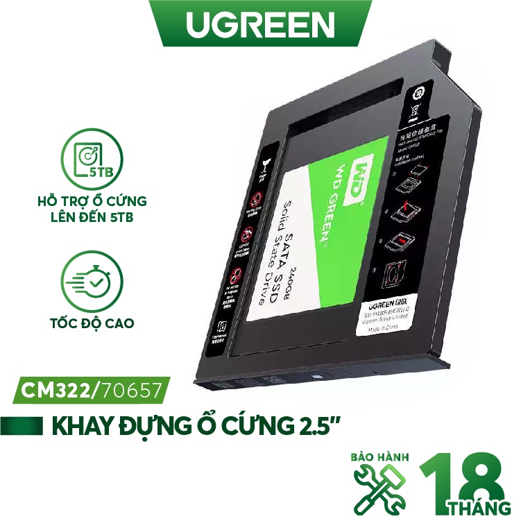 Caddy hdd khay đựng ổ cứng 2.5" Ugreen 70657 sử dụng mở rộng thêm hdd hay ssd cho máy tính laptop, hỗ trợ ổ cứng lên đến 5TB, sử dụng chuẩn sata 3.0 có tốc độ rất cao