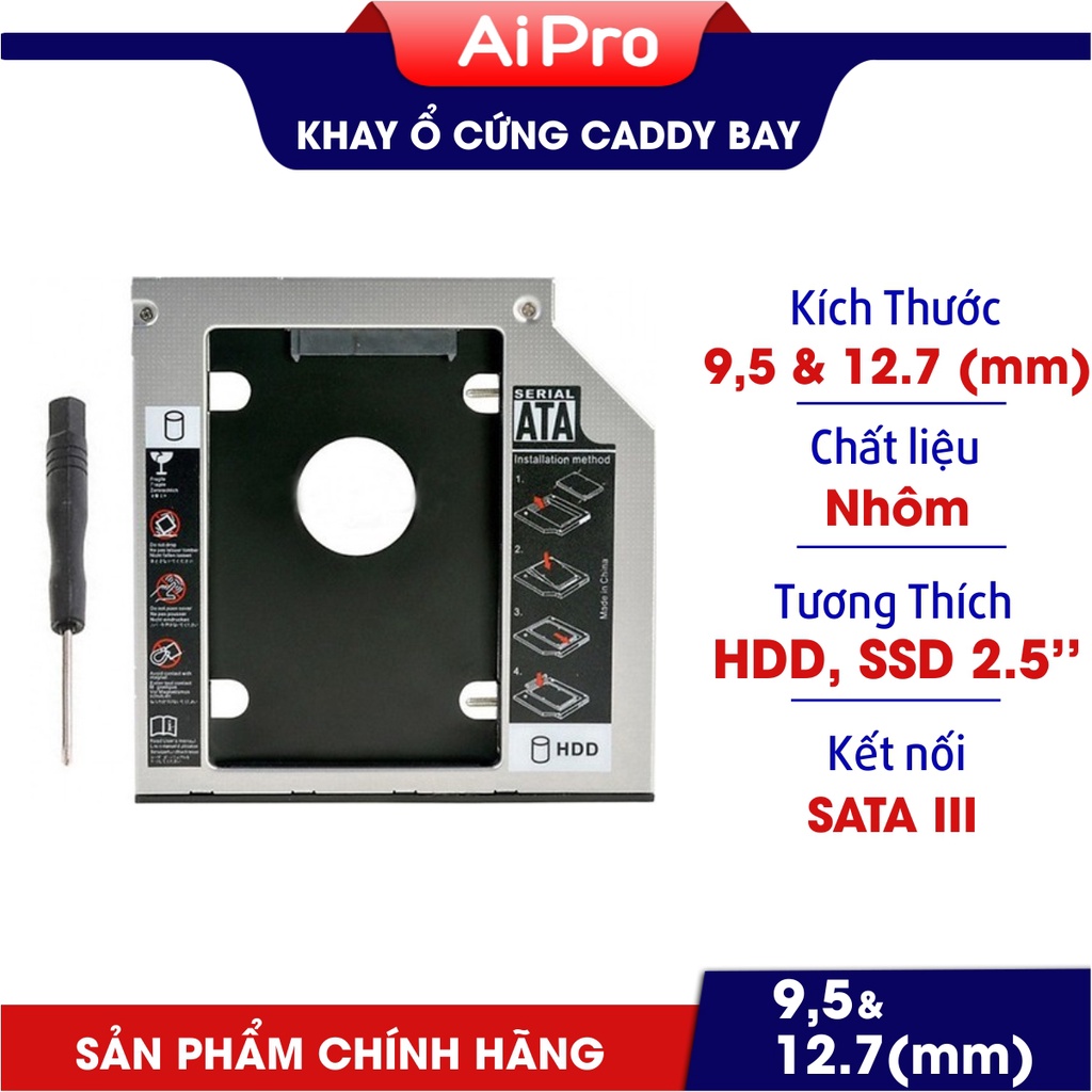 Khay đựng ổ cứng Caddybay HDD,SSD - Chất liệu Nhôm - Sata III - Thay thế ổ DVDCaddy Bay là dụng cụ để gắn thêm ổ cứng thứ 2 cho Laptop đang sử dụng ổ đĩa DVD/CD. Caddy Bay được gắn thay cho vị trí của ổ DVD (thường rất ít dung, hầu như là chẳng bao giờ sử dụng ổ đĩa DVD).