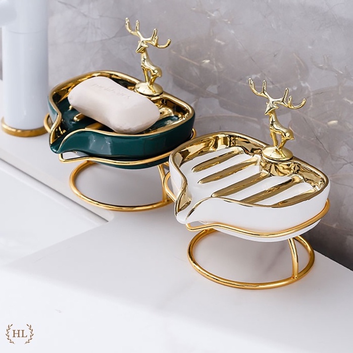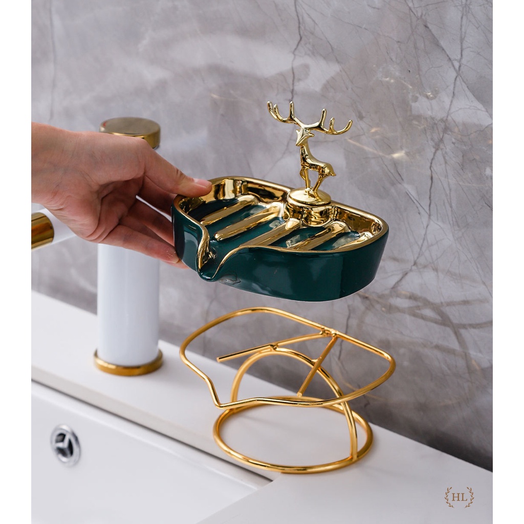 Nhà cửa & Đời sống > Đồ dùng phòng tắm > Kệ đựng xà phòng || Khay đựng xà bông hình hươu mạ vàng chất liệu sứ kèm kệ Inox vàng gương | KỆ XÀ PHÒNG RỬA TAY SỨ DECOR HÌNH HƯƠU CAO CẤPCòn hàng