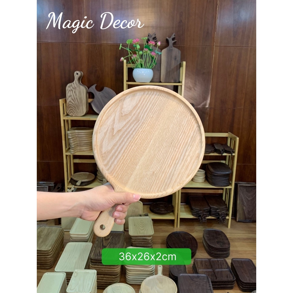 Nhà cửa & Đời sống > Bộ đồ bàn ăn > Khay, tấm lót bàn ăn || Khay gỗ decor đựng pizza hình tròn tay cầm nhiều kích thước gỗ tần bì bày đồ ăn trang trí cực đẹpCòn hàng