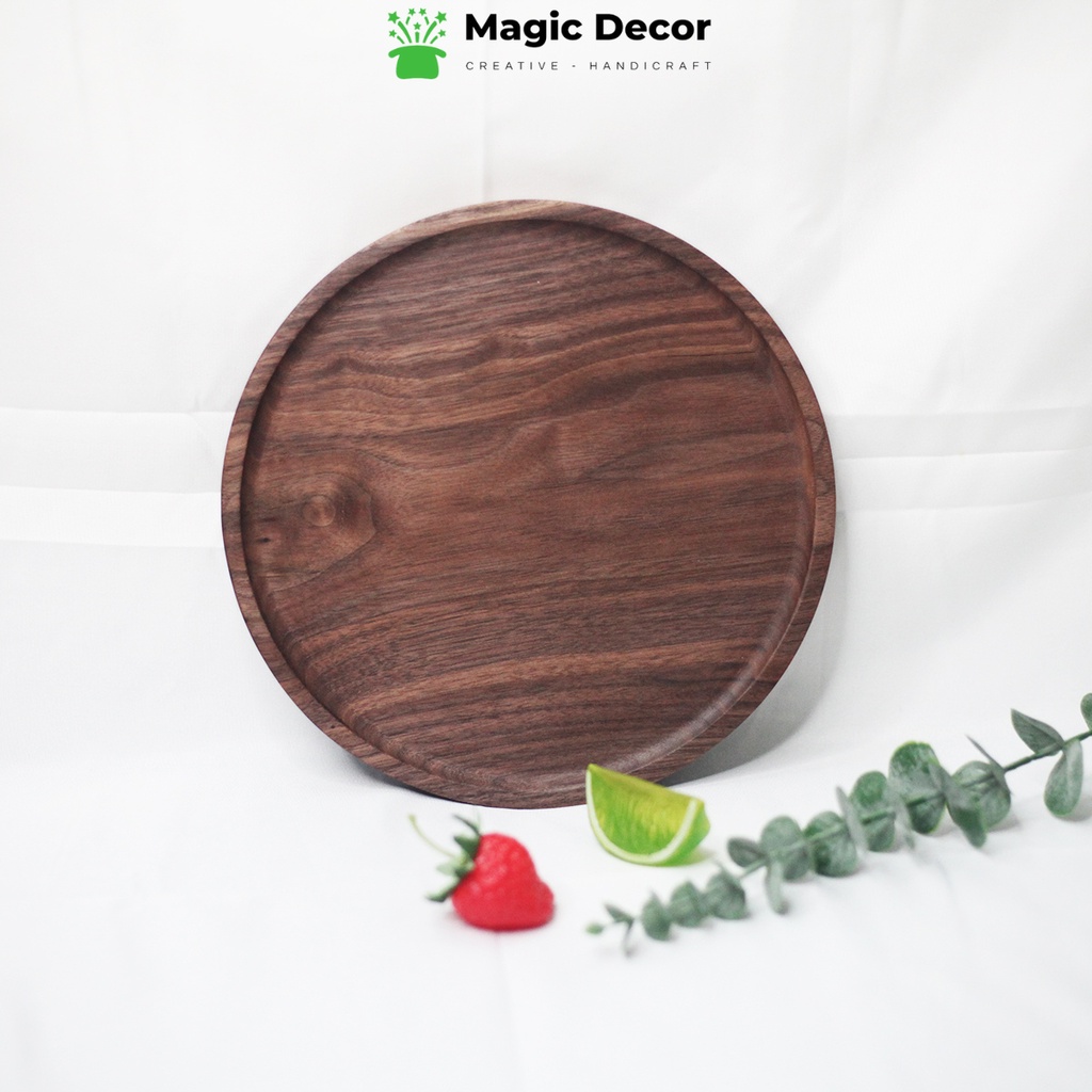 Khay gỗ decor hình tròn D22cm đựng đồ ăn trang trí làm phụ kiện chụp ảnh gỗ óc chó nguyên khối cao cấp