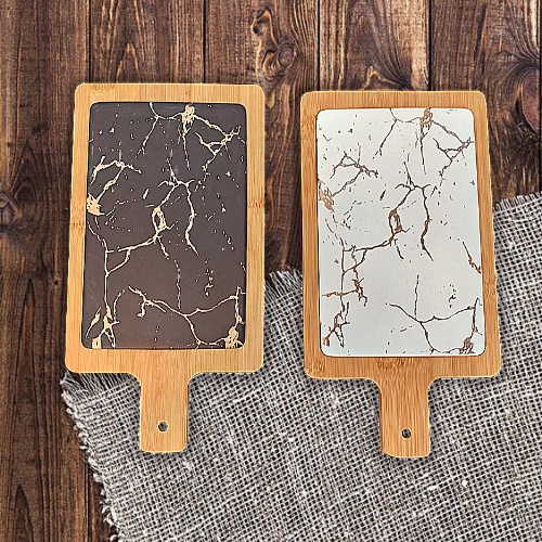 Khay gỗ phối đĩa sứ vân đá cẩm thạch - Đựng bò bít tết, pizza cực tinh tế và sang trọngVới tông màu chủ đạo là trắng và đen, cùng thiết kế vân đá cẩm thạch tinh xảo, sắc nét , sản phẩm hứa hẹn sẽ đem lại cho gian bếp nhà bạn một không gian chuẩn phong cách nhà hàng Âu.