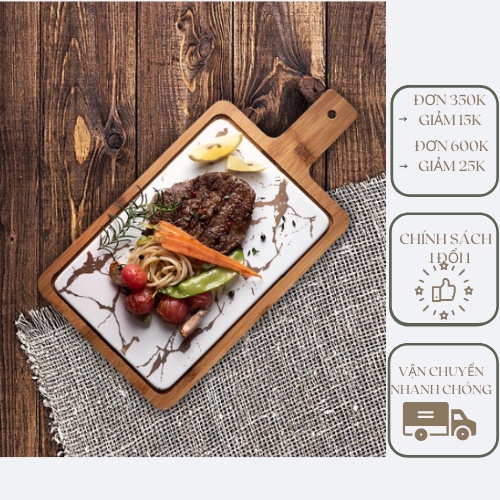 Nhà cửa & Đời sống > Bộ đồ bàn ăn > Khay, tấm lót bàn ăn || Khay gỗ phối đĩa sứ vân đá cẩm thạch - Đựng bò bít tết, pizza cực tinh tế và sang trọngCòn hàng