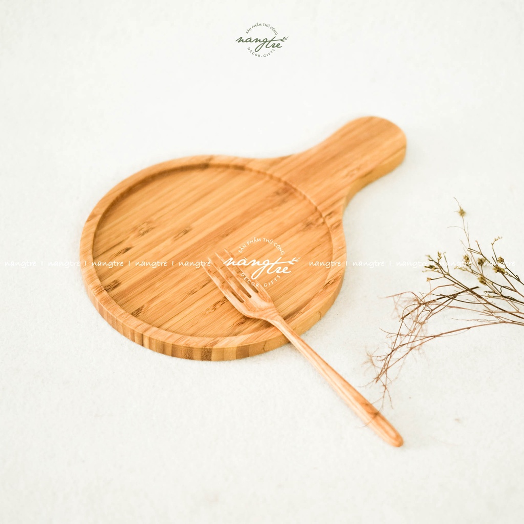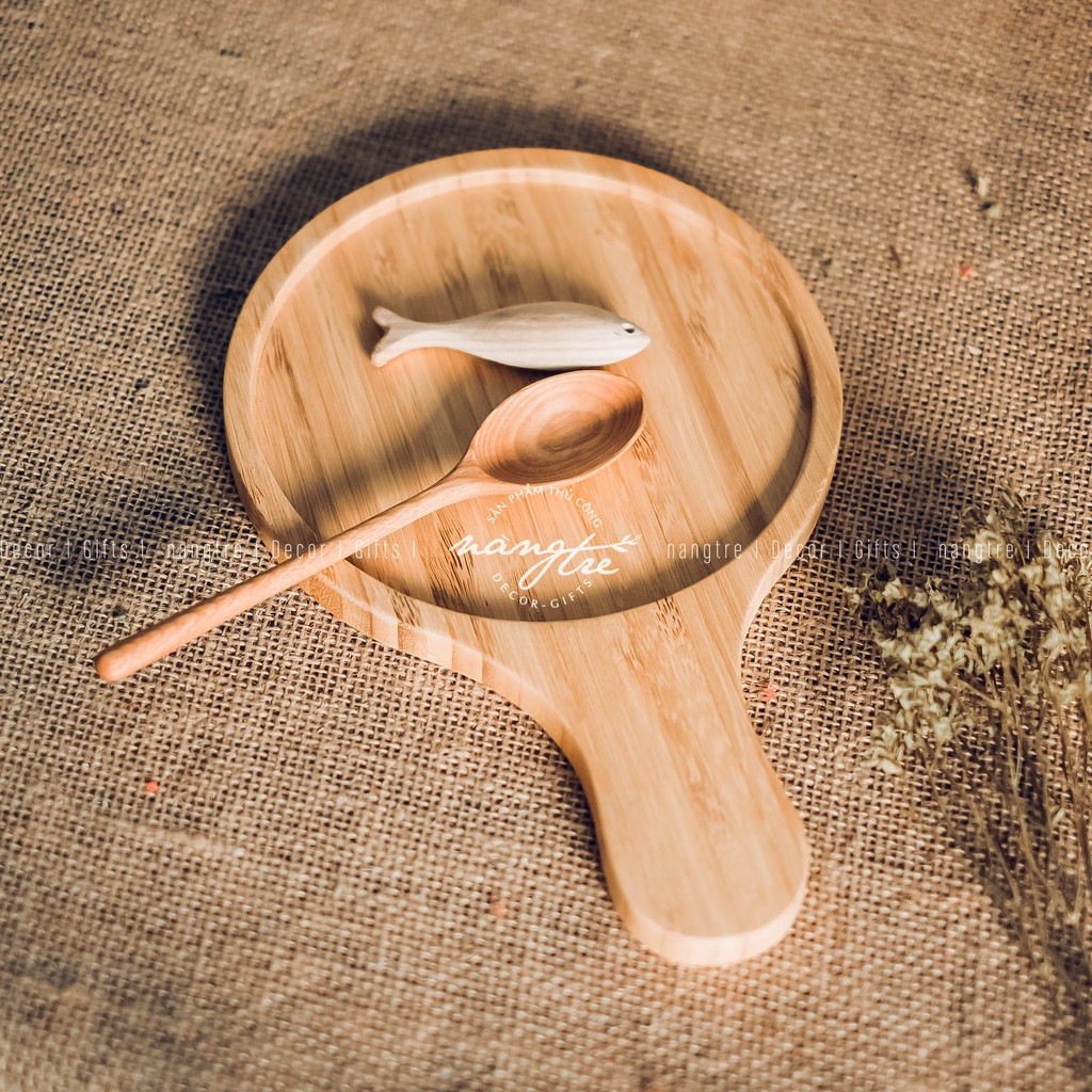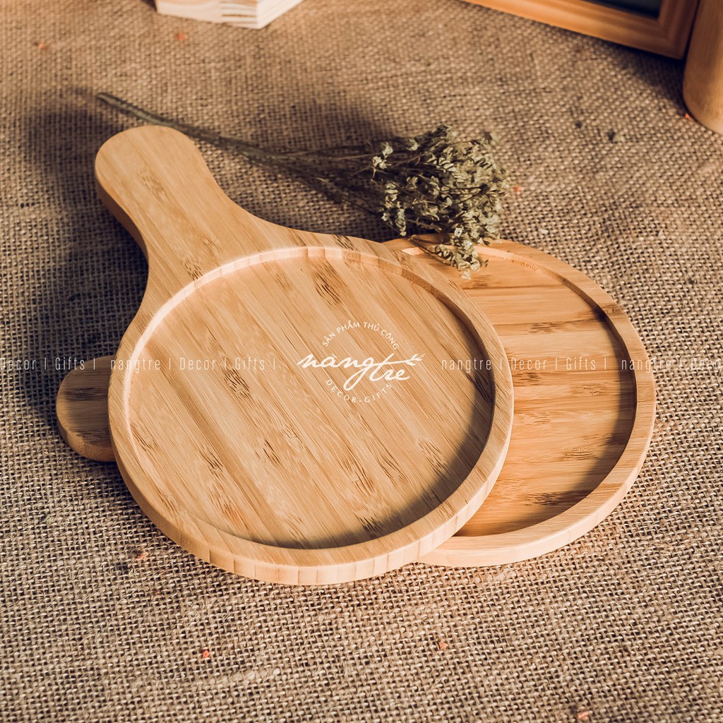 Nhà cửa & Đời sống > Bộ đồ bàn ăn > Dĩa || Khay gỗ tre đựng bánh pizza, khay gỗ tròn có tay cầm - wooden trayCòn hàng