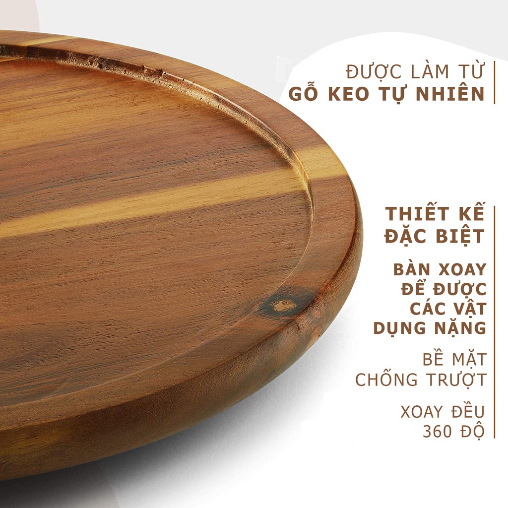 Khay gỗ tròn xoay 360 độ đường kính 25cm, decor trang trí thức ăn, đựng đồ dùng nhà bếp, là sản phẩm xuất khẩu sang USA, được sản xuất tại Việt Nam với những ưu điểm vượt trội:✅ SẢN PHẨM TỰ NHIÊN, THÂN THIỆN MÔI TRƯỜNG: Được làm 100% bằng gỗ keo tự nhiên, là loại gỗ bền, chất lượng cao và hoàn toàn an toàn thực phẩm. Đây là một sản phẩm thân thiện môi trường với thiết kế sang trọng phù hợp với căn bếp của bạn.