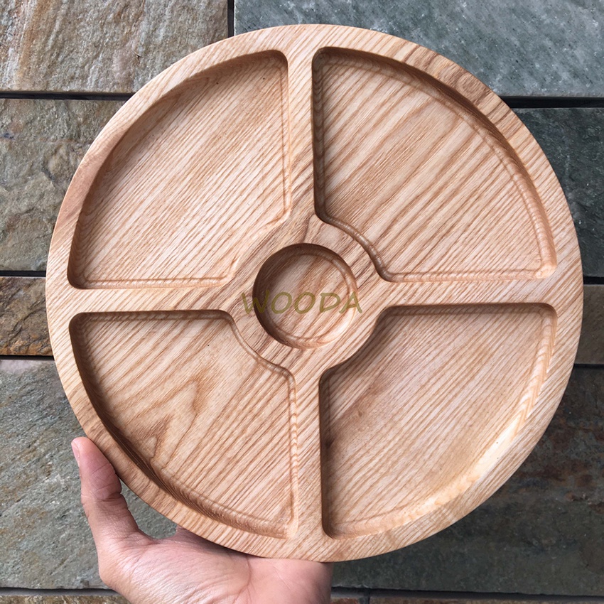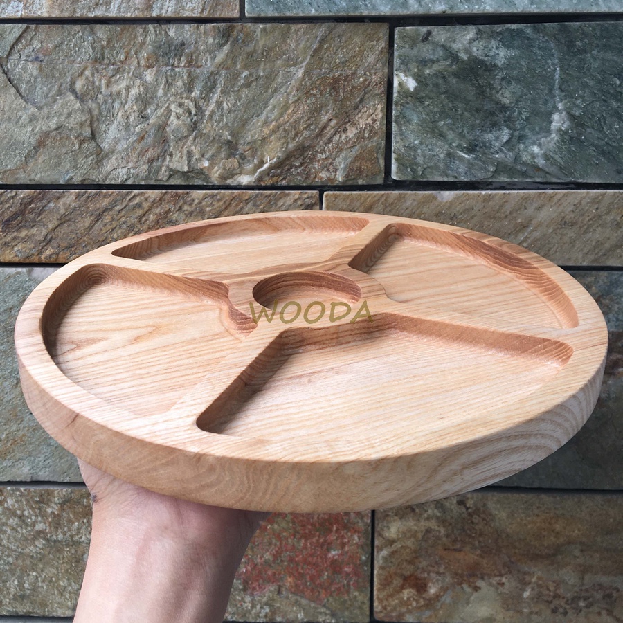 Khay gỗ tự nhiên hình tròn 4 ngăn kích thước 25x5x25x5cm, khay đựng bánh mứt, khay gỗ decor