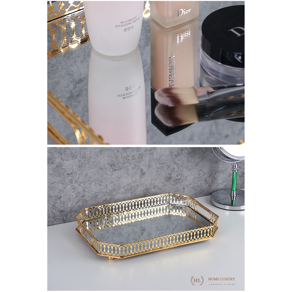 Sản phẩm khay gương trang trí ấn tượng với nhiều kiểu dáng khác nhauSản phẩm được thiết kế theo phong cách Hoàng gia kết hợp đường viền vàng xuyên suốt sản phẩm.