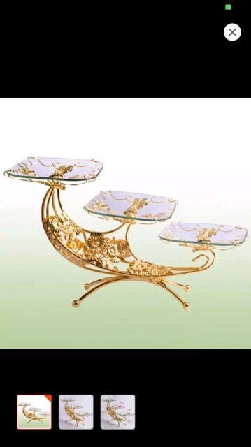 Khay đựng hoa quả , bánh kẹo trang trí bàn tiệc , bàn ăn , bày trang trí tủ rượu phòng khách cực sang chảnh nhé . Khay gồm 3 khay làm bằng thuỷ tinh cao cấp dầy dặn trong suốt và kệ đỡ hình chiếc thuyền cách điệu được mạ vàng bằng công nghệ pvd 5 năm chưa xuống mầu . Có hộp đựng bảo quản khi không dùng đến nhéBạn nào mua trên 5 chiếc ibshop sẽ có giá tốt ah . Shop ở Minh Khaib- hà nội 0927448886