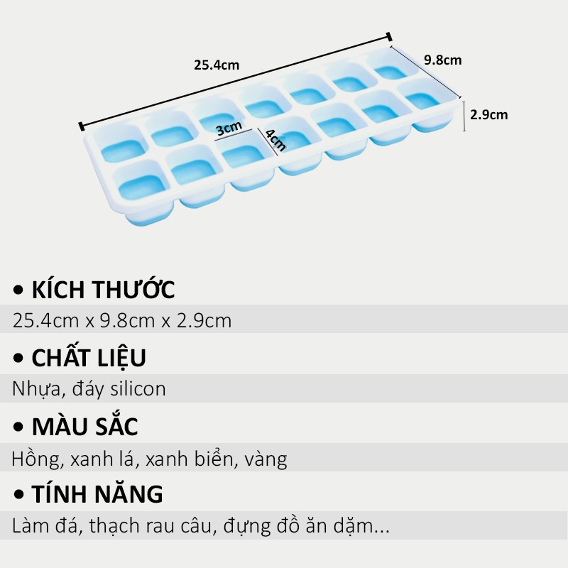 - Kích thước: 26 cm x 9.5 cm; 1 khay có 14 ô làm đá (20ml/ô)