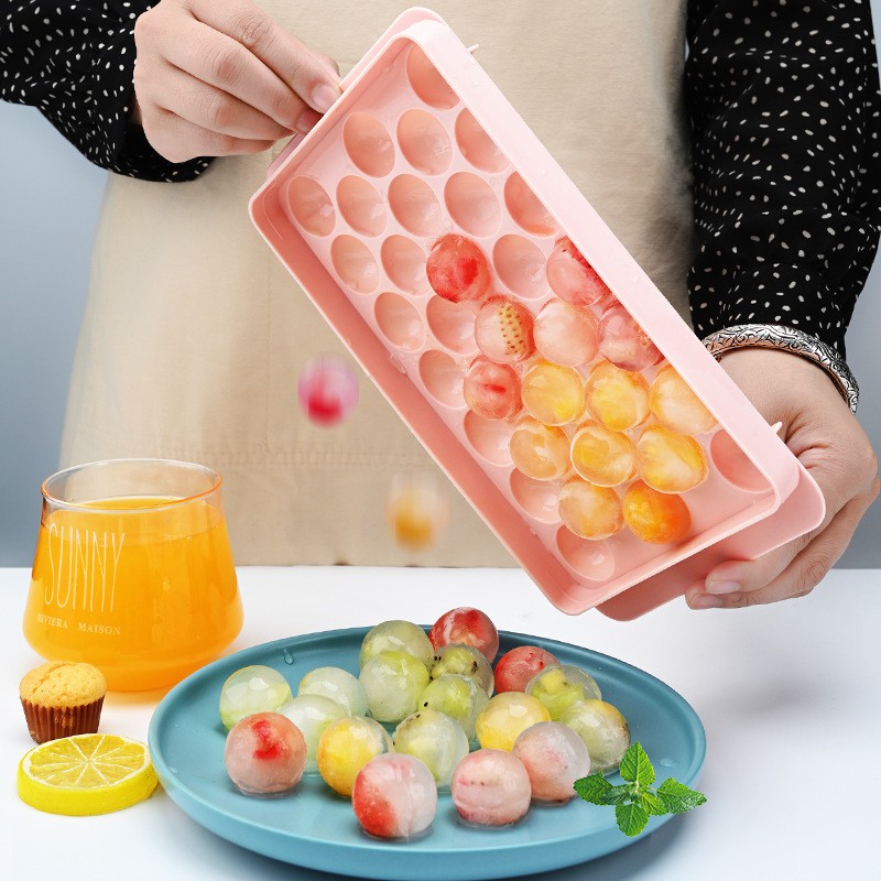 Khay Làm Đá Tròn 33 Viên Bi Khuôn Làm Đá, Làm Thạch Rau Câu Hoa Quả Có Nắp Đậy Khử Mùi Tủ Lạnh Cao Cấp
