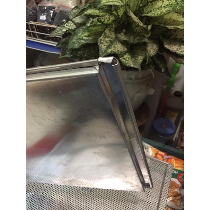 Khay liền làm từ nhôm không gỉ. Nhôm dày 2 ly sáng bóng như hình.Kích thước 49,5*34cm. Cao 1.5cm. Tai lò mỗi bên 1,5cm.