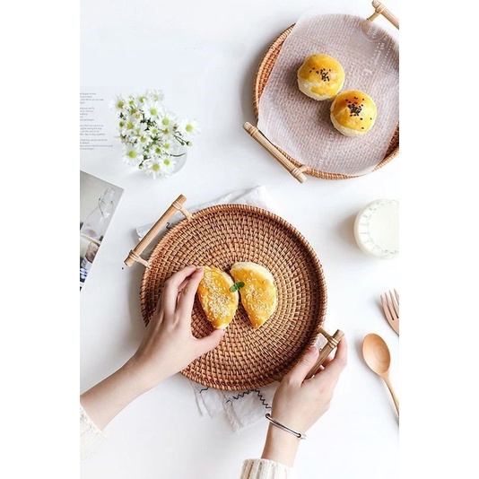 Khay mây đựng đồ uống trà [Handmade], khay guột xiên có quai, dễ sử dụng, đã xử lý qua chất chống mối mọt mốcKhay mây hình tròn có tay cầm, trưng bày món ăn, decor, chụp hình, phụ kiện bàn ăn, khay decor