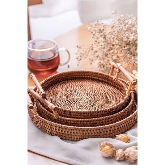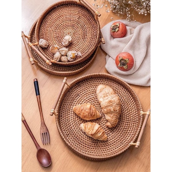 Khay mây đựng đồ uống trà , hình tròn có tay cầm, trưng bày món ăn, phụ kiện bàn ăn, khay decor
