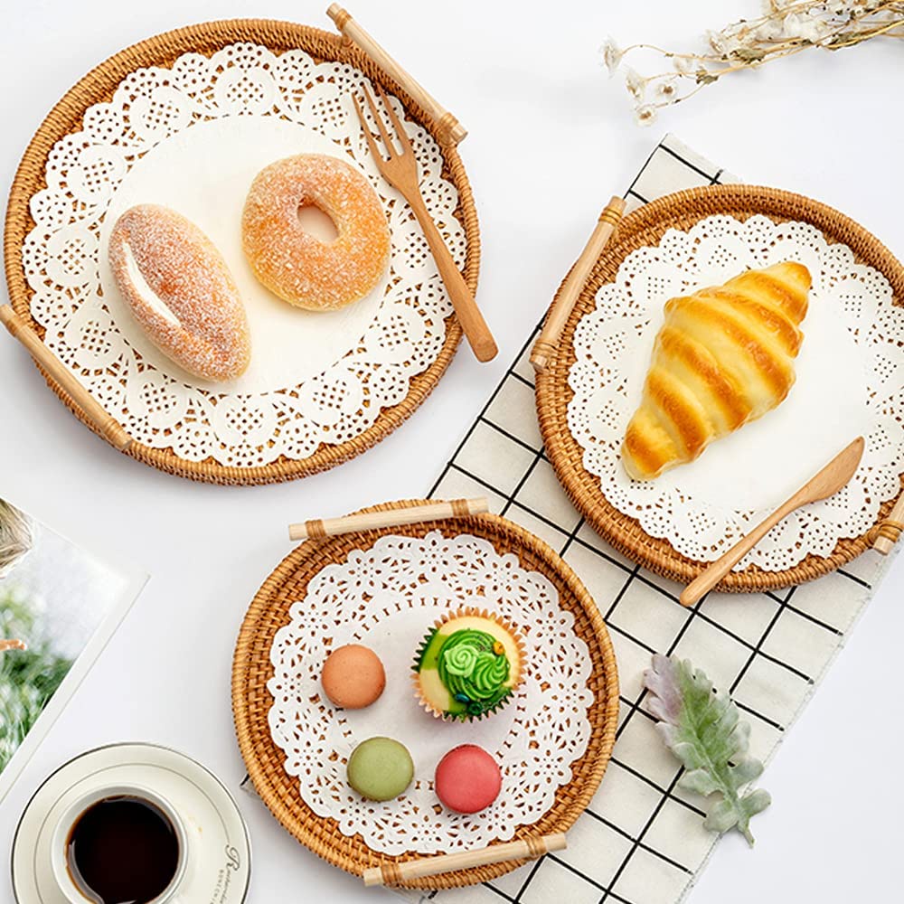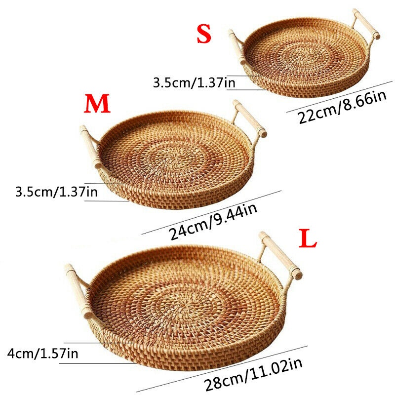 Giới thiệu Khay mây quai đựng đồ uống trà , hình tròn có tay cầm, trưng bày món ăn, chụp hình, phụ kiện bàn ăn, decor