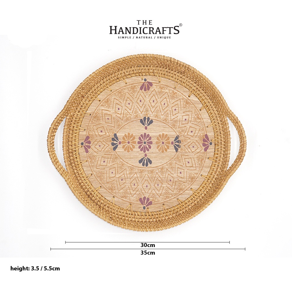 Khay mây tròn có tay cầm cong đáy hoa văn