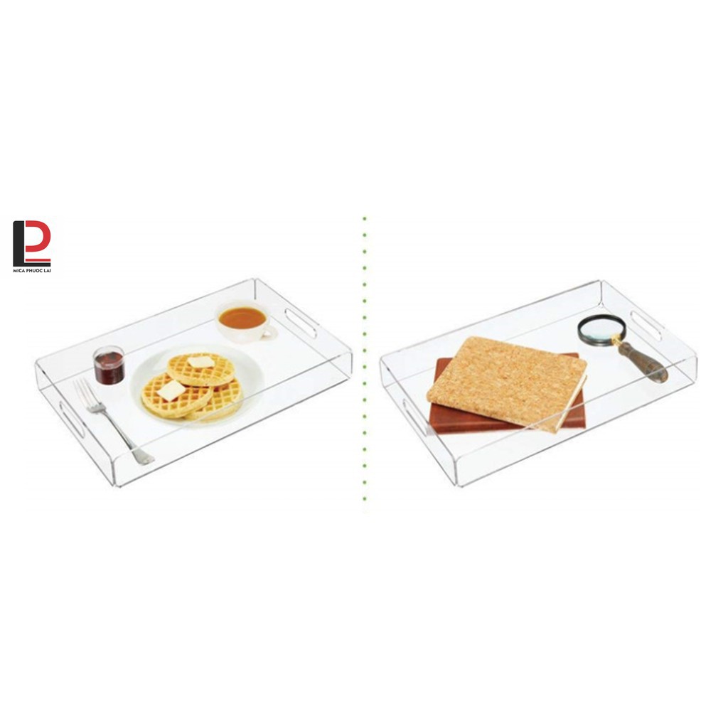 Sản phẩm khay mica được thiết kế và gia công có kích thước của một hình chữ nhật. Để giúp bạn sử dụng thuận tiện nhất thì mẫu khay này còn có phần quai cầm ở 2 bên. Do đó, khi bạn bưng bê cũng luôn cảm thấy thoải mái. Đặc biệt, khi bạn bưng bê đồ nóng thì sẽ đảm bảo an toàn tốt nhất.