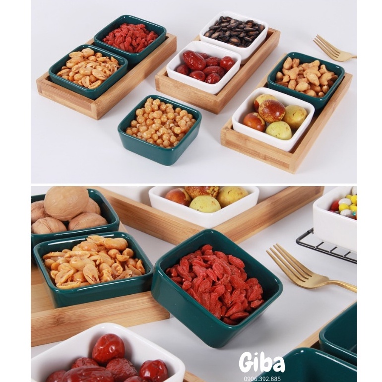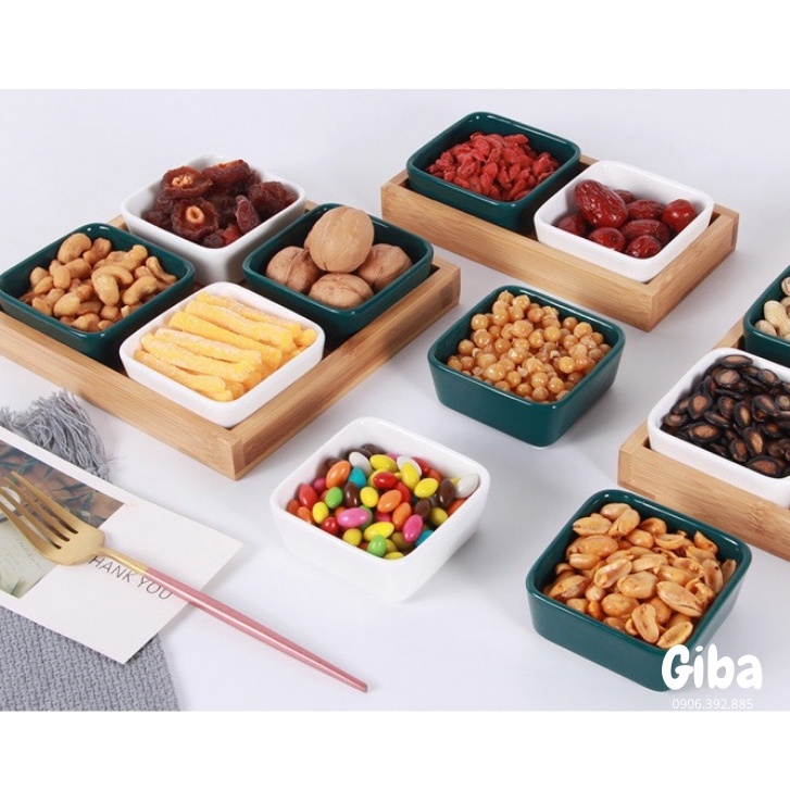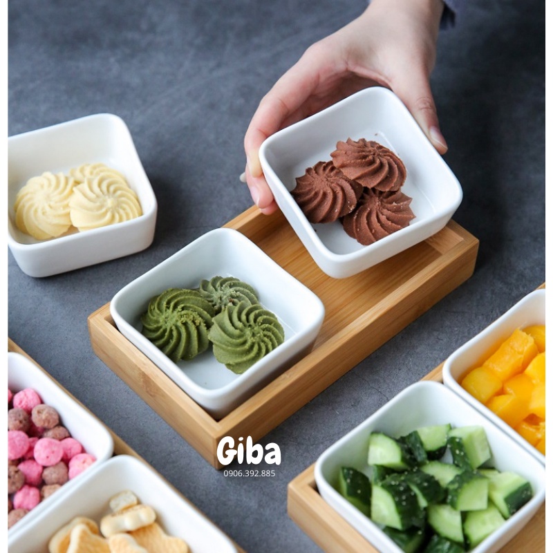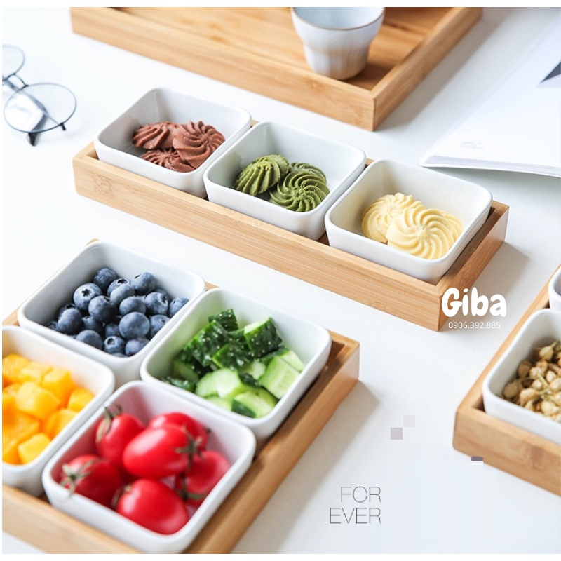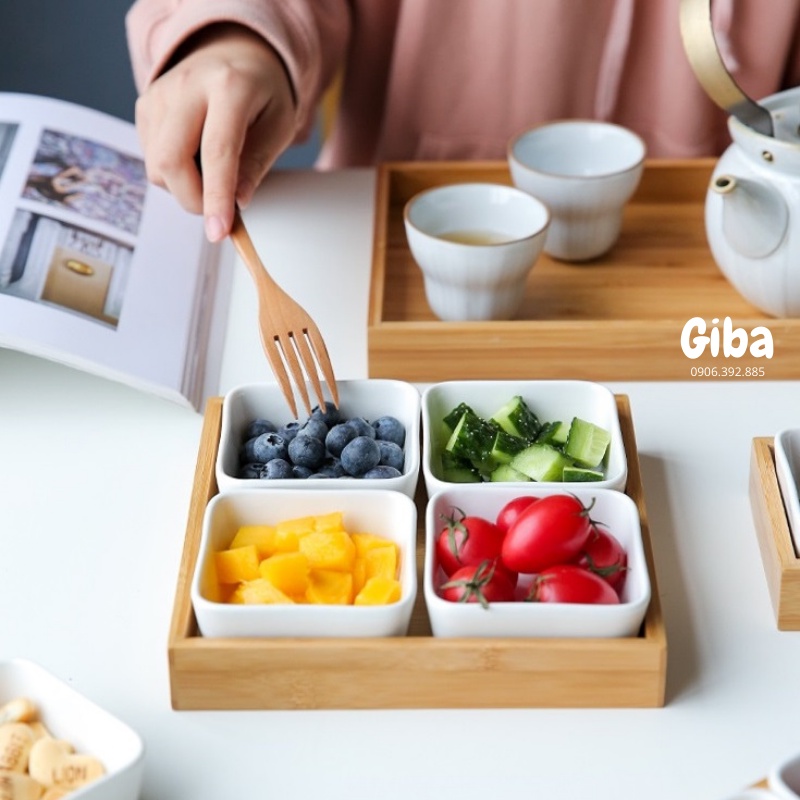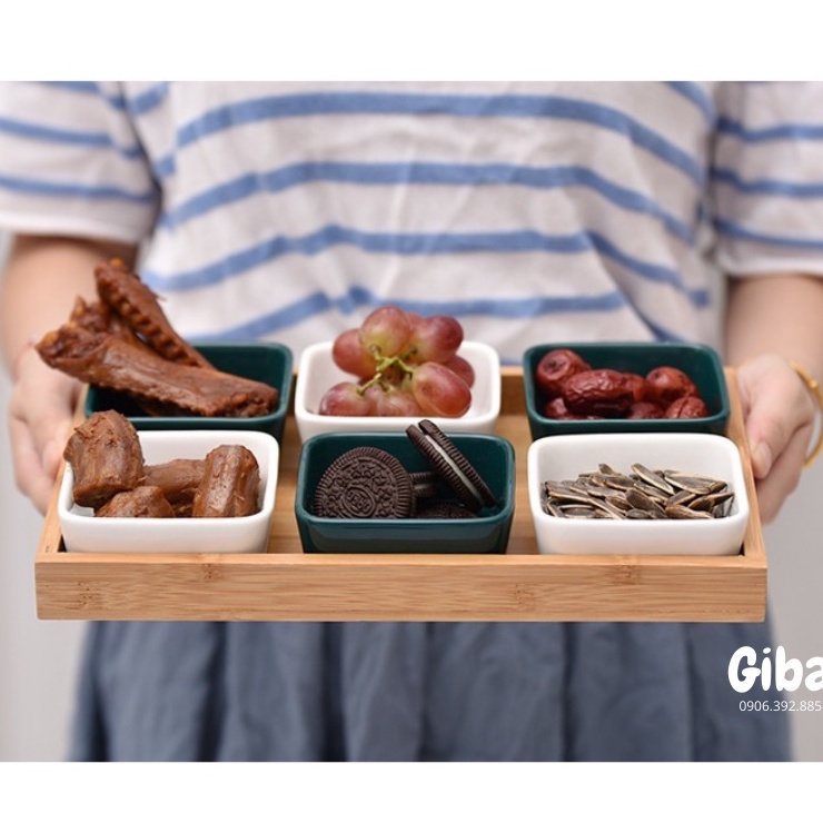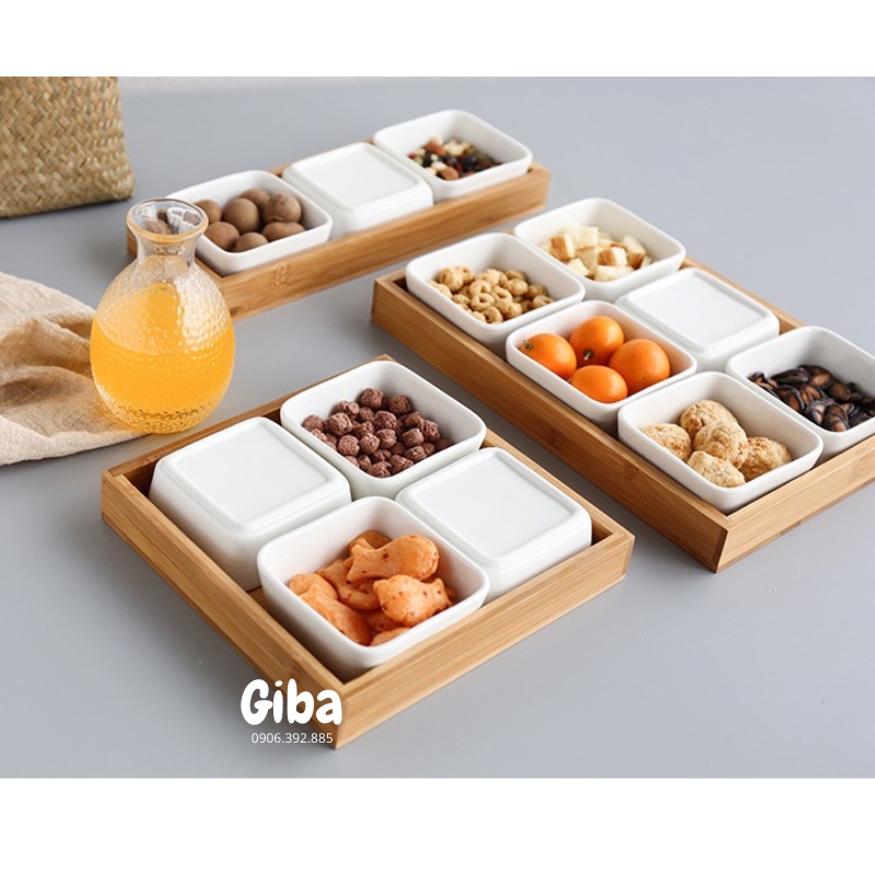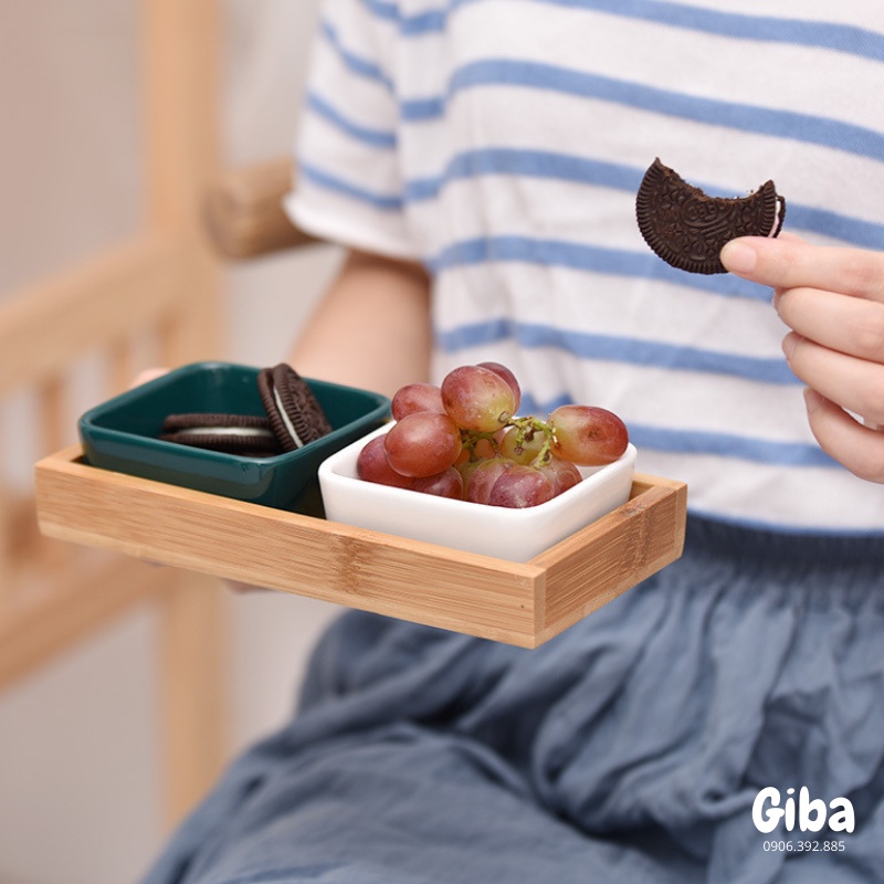 Khay gỗ kèm chén sứ đựng đồ ăn nhẹ, phụ kiện chụp ảnh sản phẩm decor nhà bếpKhay gỗ kèm chén sứ đựng đồ ăn nhẹ, phụ kiện chụp ảnh sản phẩm decor nhà bếp được dùng cho nhiều mục đích khác nhau. Khay được thiết kế theo phong cách Nhật Bản cực kỳ bắt mắt, tiện lợi và sang trọng.