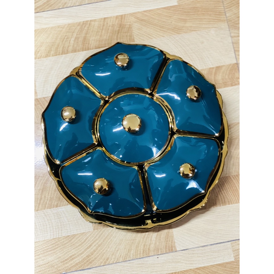 Khay mứt sứ Bắc Âu xanh viền vàng cấp 6 ngăn tiện lợi có đế xoay 360 độ, phụ hợp ngày lễ tết gia đình, đơn giản santrọng
