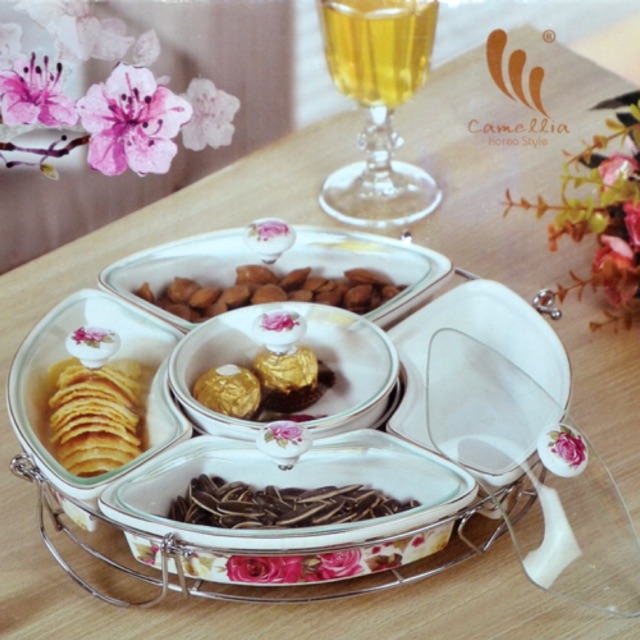 Khay đựng mứt tết 5 ngăn bằng sứ ceramic có đế xoay với thiết kết khay có năm ngăn riêng biệt và có nắp đậy.- Thiết kế vô cùng tinh tế và hiện đại, không chỉ là đồ vật tiện dụng mà còn là vật trang trí giúp không gian phòng khách nhà bạn thêm sang trọng
