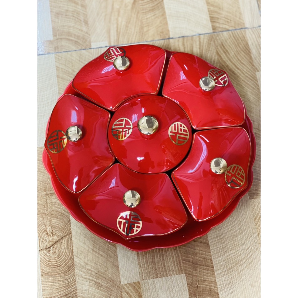 Khay Mứt Tết, Khay Đựng Bánh Kẹo [Sứ Cao Cấp], màu đỏ Tết Nguyên Đán, giao hàng an toàn họa tiết chữ lộc viền vàng