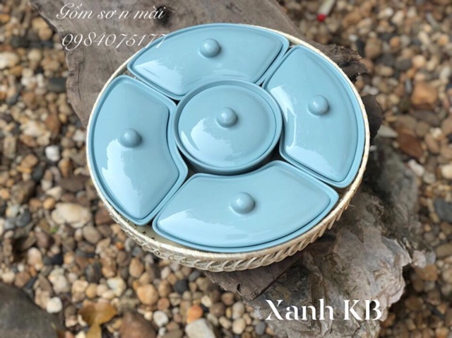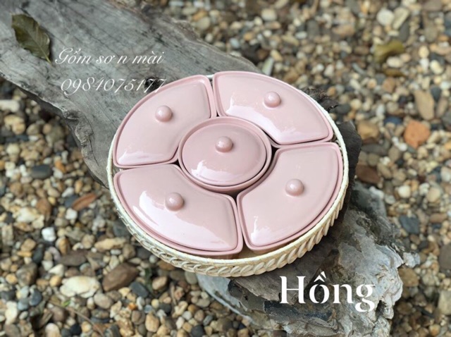 Bộ sản phẩm khay mứt Tết mài pastel hiện đại, trẻ trungBộ sản phẩm gồm : khay mây + 5 ngăn sứ kèm nắp