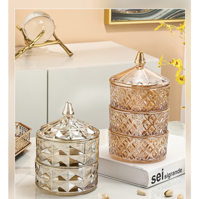 Thố thủy tinh pha lê nhiều tầng đựng mứt, hạt khô có hai phiên bản cho bạn chọn lựa: trong suốt và vàng đồng