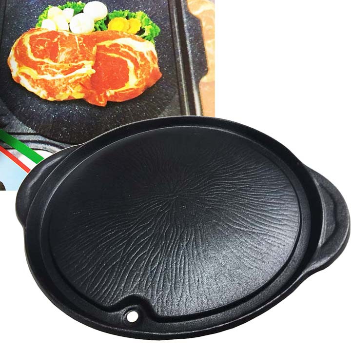 Khay nướng chống dính tròn 32cm đen là khay dùng cho tất cả các loại bếp như: bếp điện quang, bếp hồng ngoại, bếp ga, bếp than/lò ... Khay gang nướng với men chống dính dầy mịn có thể sử dụng trên tất cả các loại bếp/lò. Khay gang nướng truyền nhiệt tốt và giữ nóng lâu.Khay nướng được chống dính cao cấp là sản phẩm lí tưởng để nướng các loại thực phẩm từ thịt cá cho đến rau củ quả.