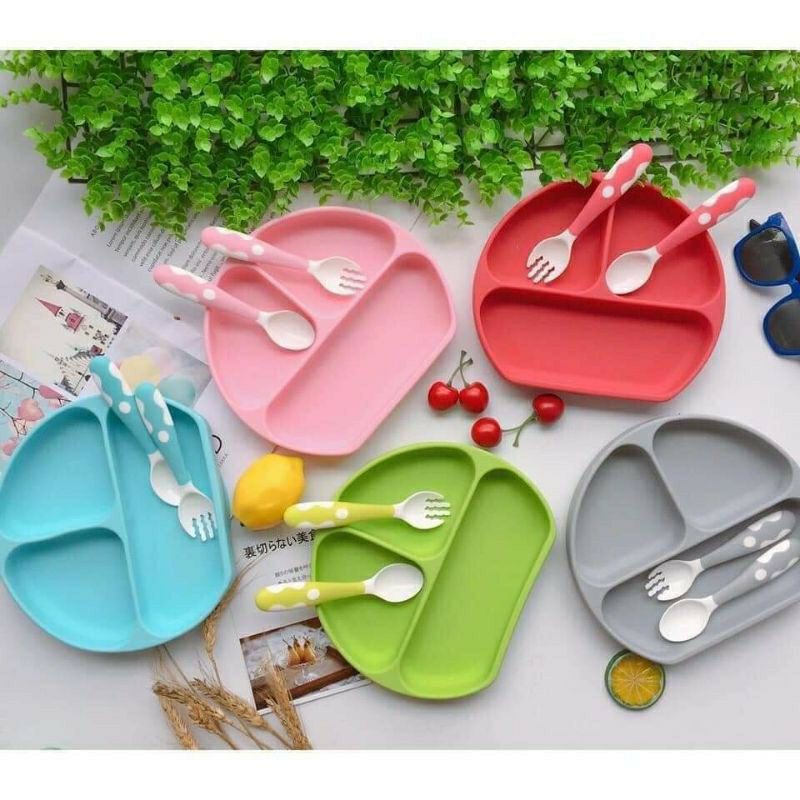 Khay Silicon ăn dặm, đế hít chống đổ, chống lật, chia 3 ngăn