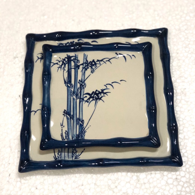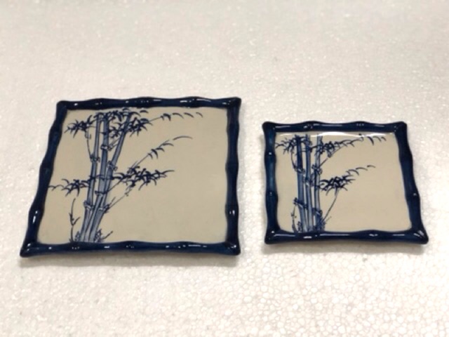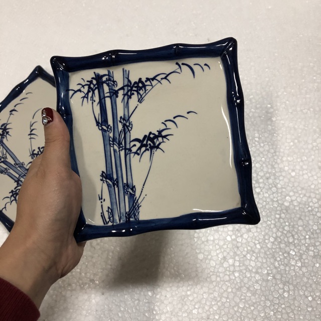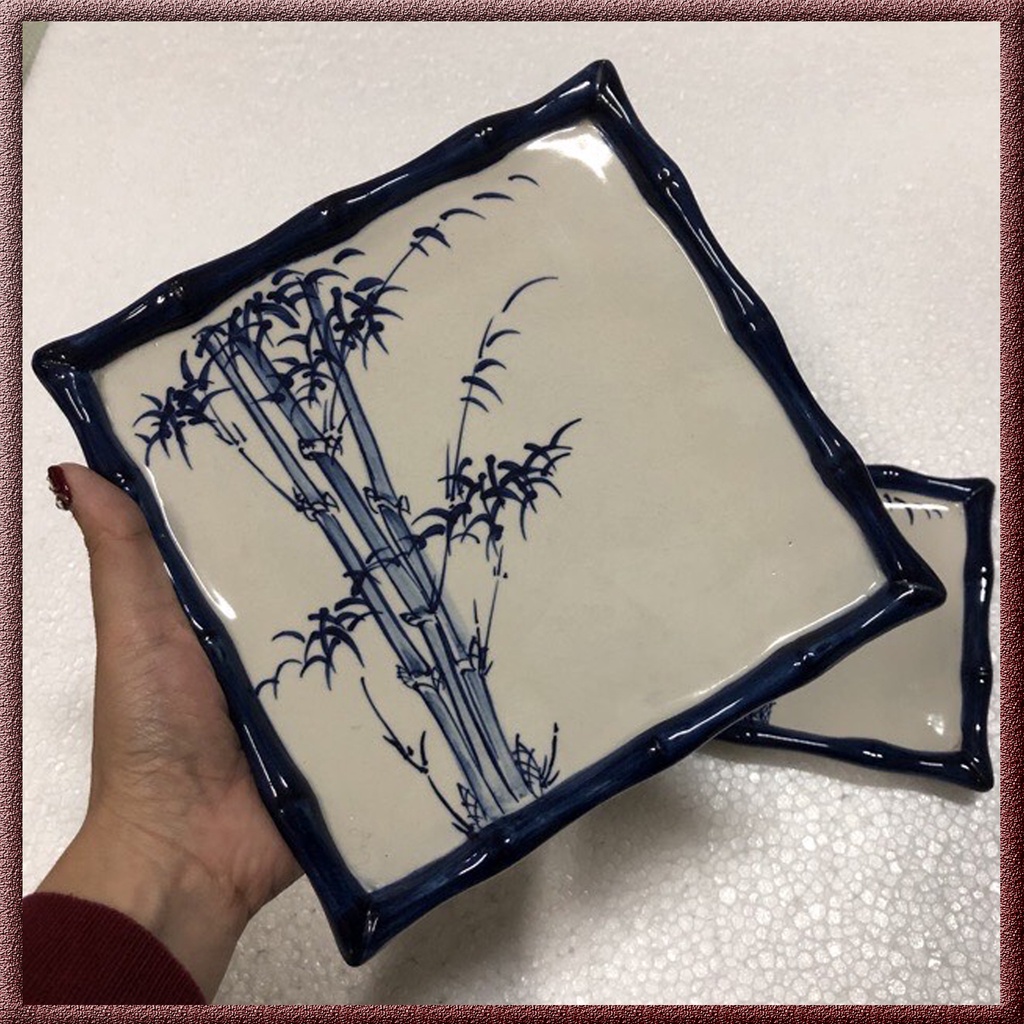 Khay sứ đĩa sứ hình vuông Bát Tràng vẽ lá trúc