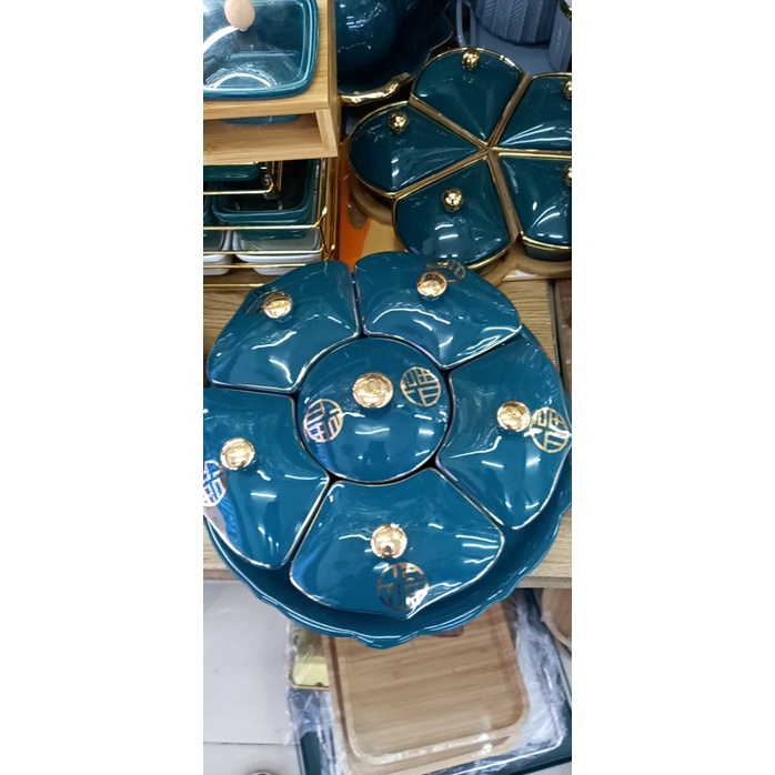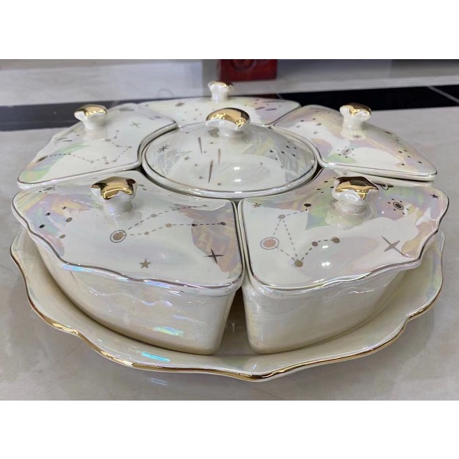 Nhà cửa & Đời sống > Bộ đồ bàn ăn > Khay, tấm lót bàn ăn || Bộ khay sứ đựng bánh mứt kẹo cao cấp ngôi sao xanh, trắng, thích hợp dùng trong ngày lễ tết, các buổi tiệcCòn hàng