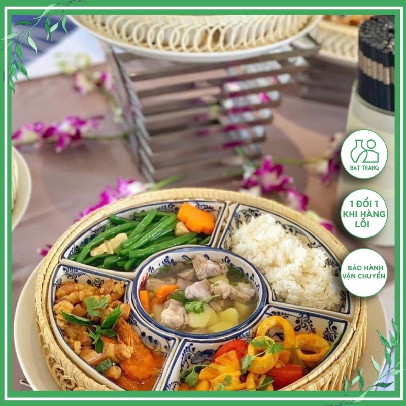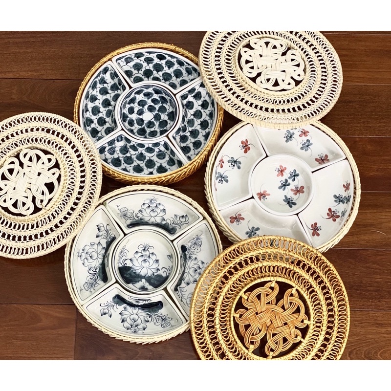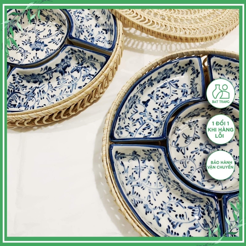 Khay sứ đựng thức ăn cơm phần Bánh kẹo Tết Set khay mây sứ hoạ tiết gốm Bát tràng vẽ tay