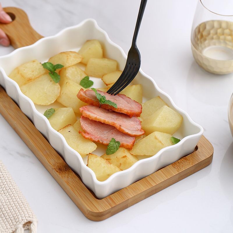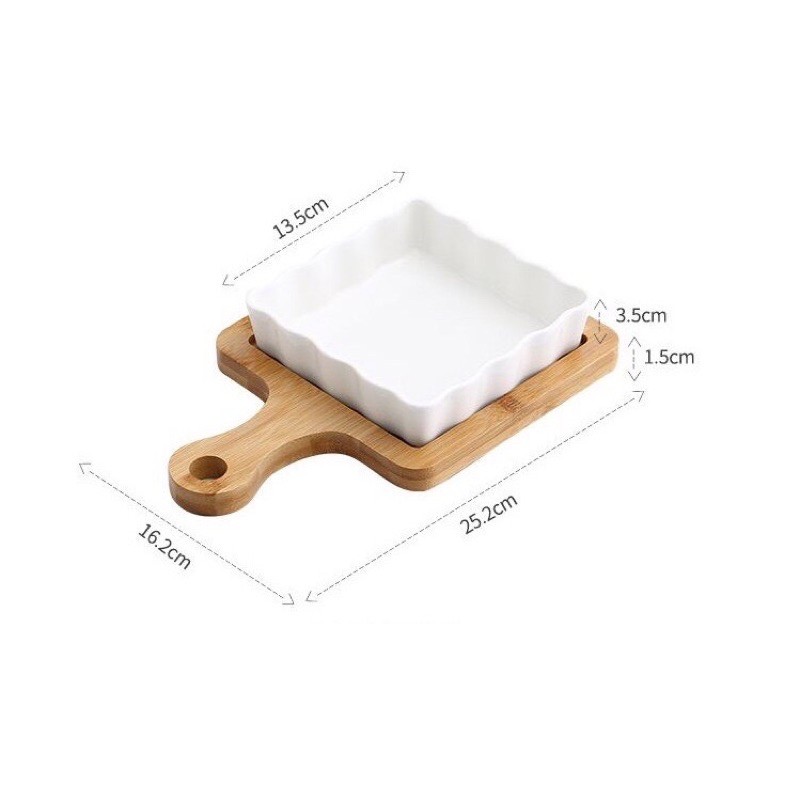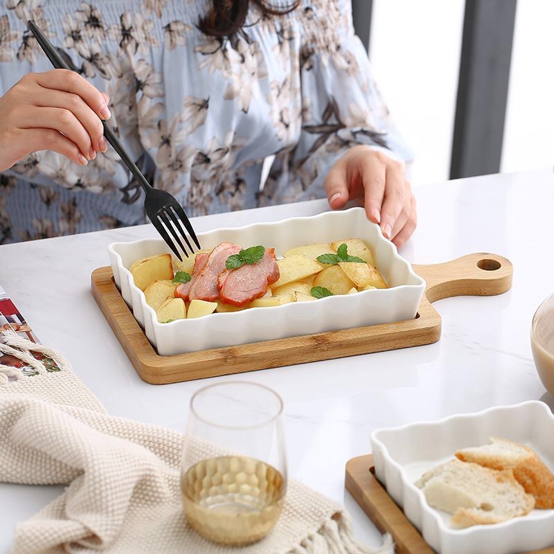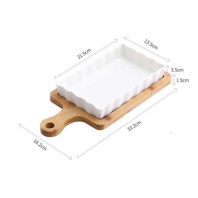 Nhà cửa & Đời sống > Bộ đồ bàn ăn > Dĩa || Khay sứ nướng chữ nhật kèm đế gỗ, khay nướng bánh ,đựng đồ ăn sáng, Đĩa gỗCòn hàng