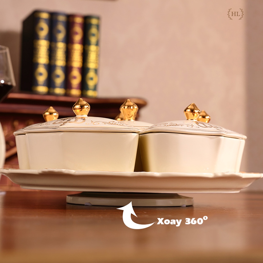 KHAY SỨ TRÒN CÓ NẮP ĐẬY HOÀNG GIA CAO CẤP XOAY 360 ĐỘ KẺ VÀNG KIM CHO SẢNH PHÒNG KHÁCH - BIỆT THỰ ĐỰNG BÁNH KẸO 2022