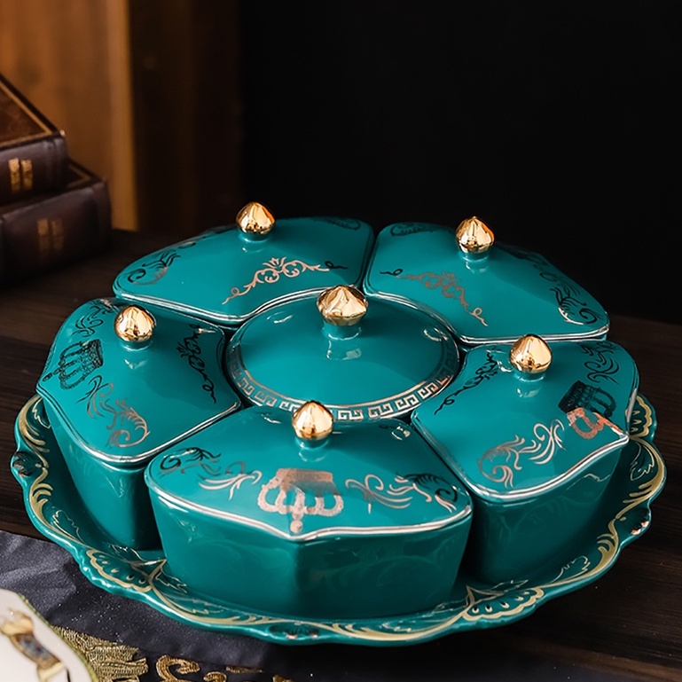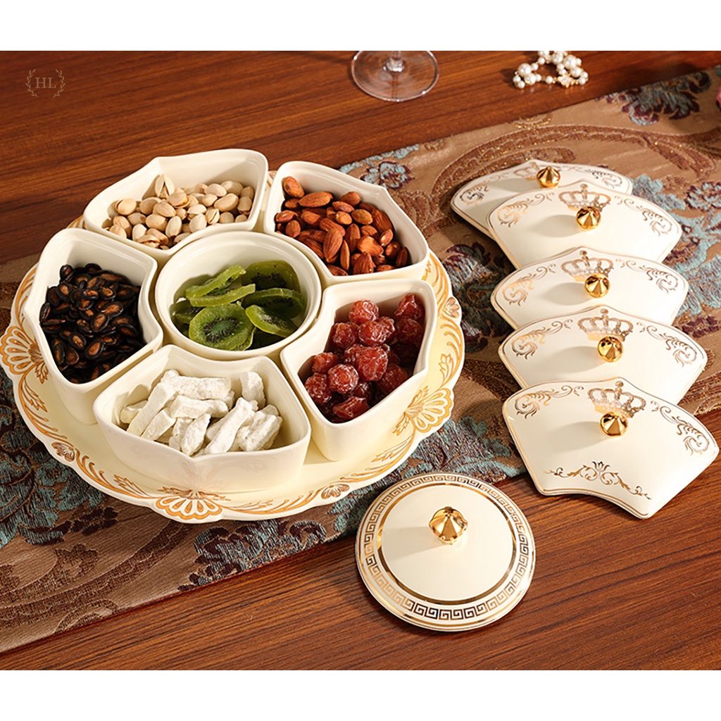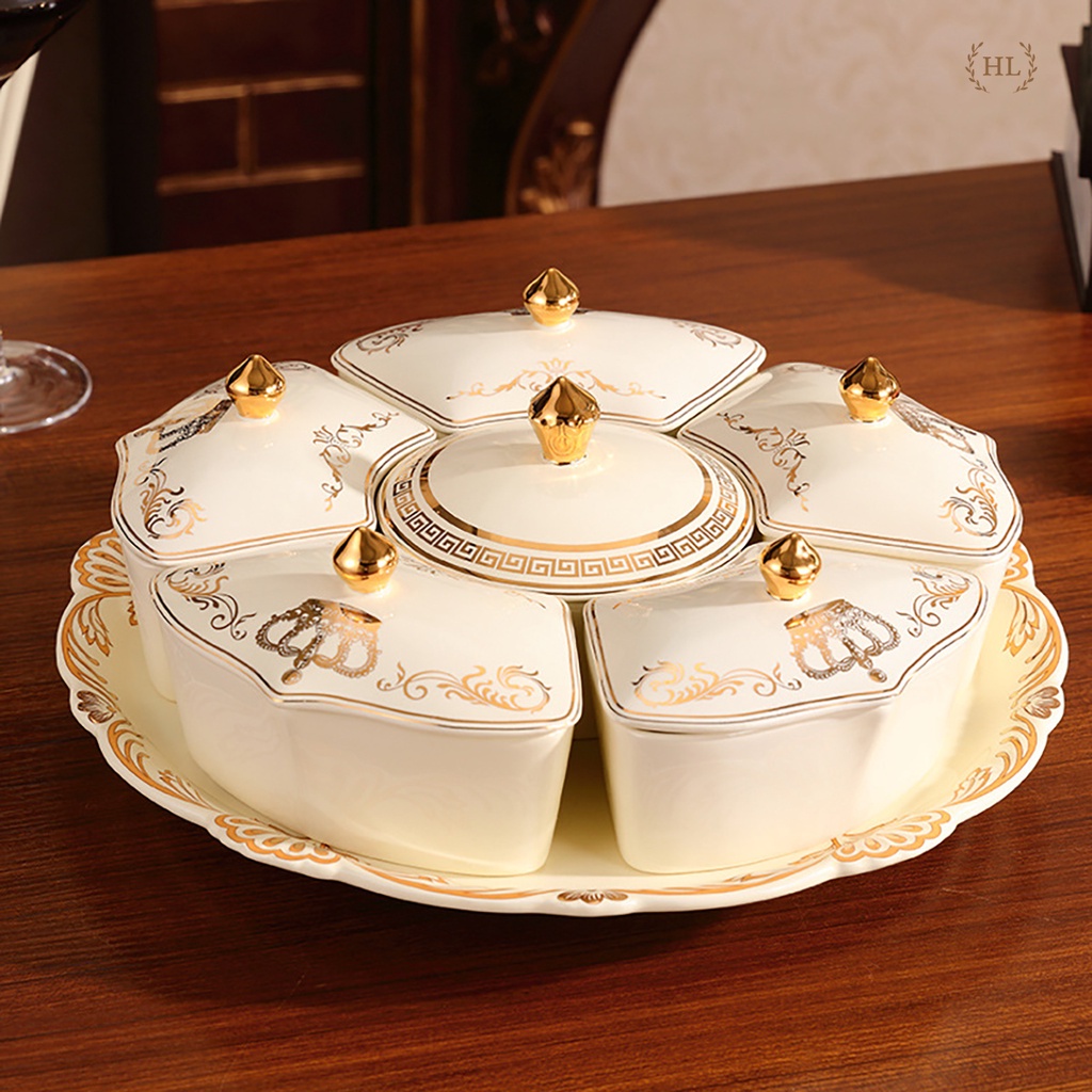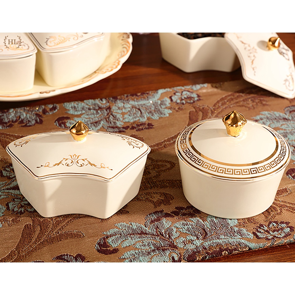 Nhà cửa & Đời sống > Bộ đồ bàn ăn > Dĩa || KHAY SỨ TRÒN CÓ NẮP ĐẬY HOÀNG GIA CAO CẤP XOAY 360 ĐỘ KẺ VÀNG KIM CHO SẢNH PHÒNG KHÁCH - BIỆT THỰ ĐỰNG BÁNH KẸO 2022Còn hàng