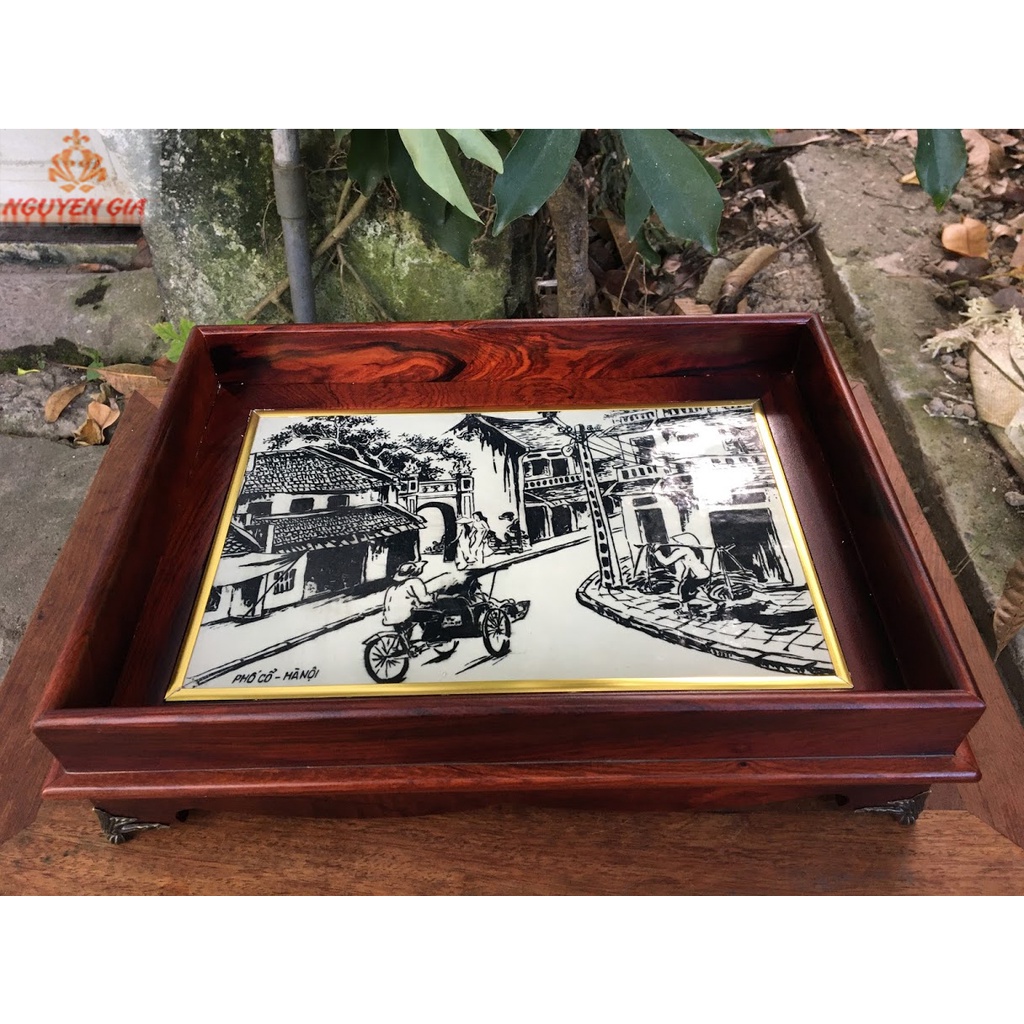 - Khay trà gỗ cẩm mẫu góc phố cổ Hà Nội với hình ảnh bác đạp xích lô đang thong thả từng vòng xe nhẹ, với hình cô bán hàng đang gánh hàng rảo bước trong một góc phố cổ hà nội tạo cảm giác nhẹ nhàng mà sâu lắng.