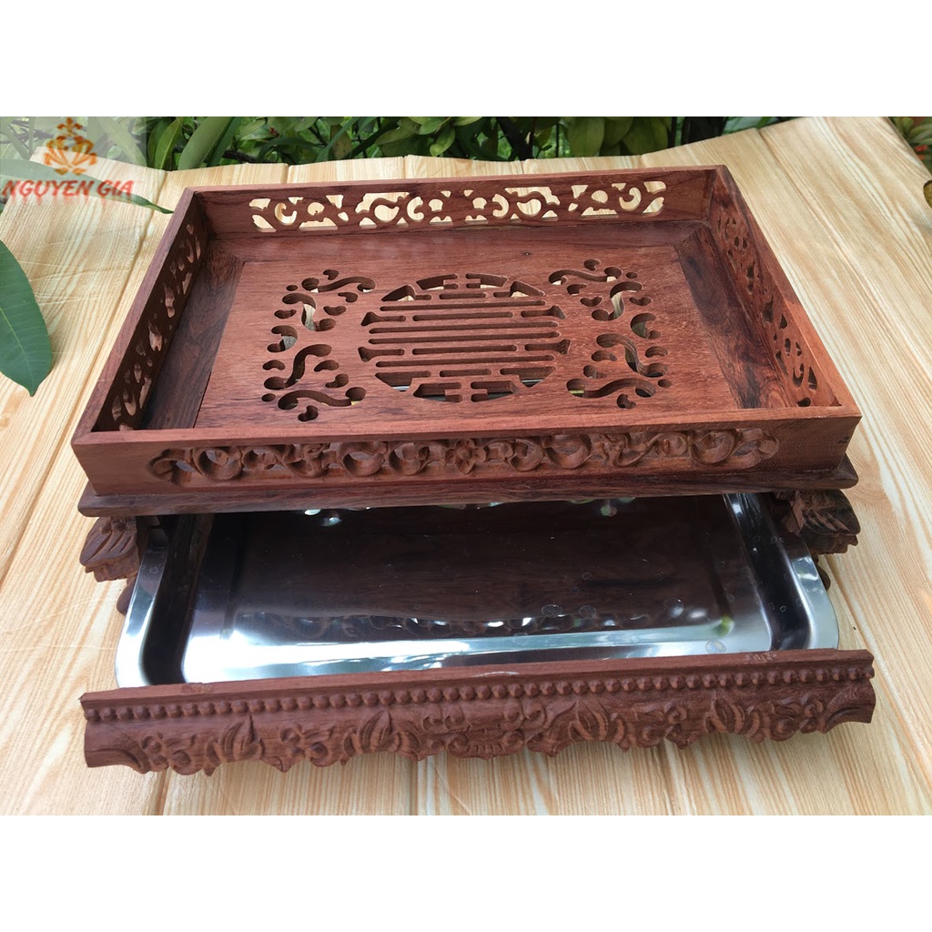 - Khay được gia công cẩn thận tới từng chi tiết, các đường nét trạm khắc có chiều sâu và rất có hồn tạo nên cảm giác thư thái, thanh tịnh mỗi khi ngồi bên bàn trà.