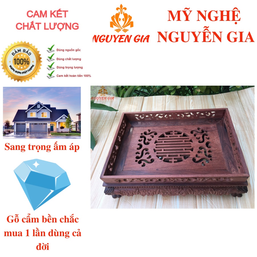 - Khay trà gỗ CẨM mẫu trạm Rồng là sự kết hợp giữa phong cách cổ điển, hiện đại sang trọng phù hợp với gu thẩm mỹ, nét độc đáo trong văn hóa thưởng trà của người Việt. Màu sắc của khay sang trọng tạo điểm nhấn cho bàn trà và phòng khách của bạn. Sản phẩm vô cùng an toàn, có thể sử dụng được từ 10 -20 năm thậm chí lâu hơn và không lo cong vênh, mối mọt.