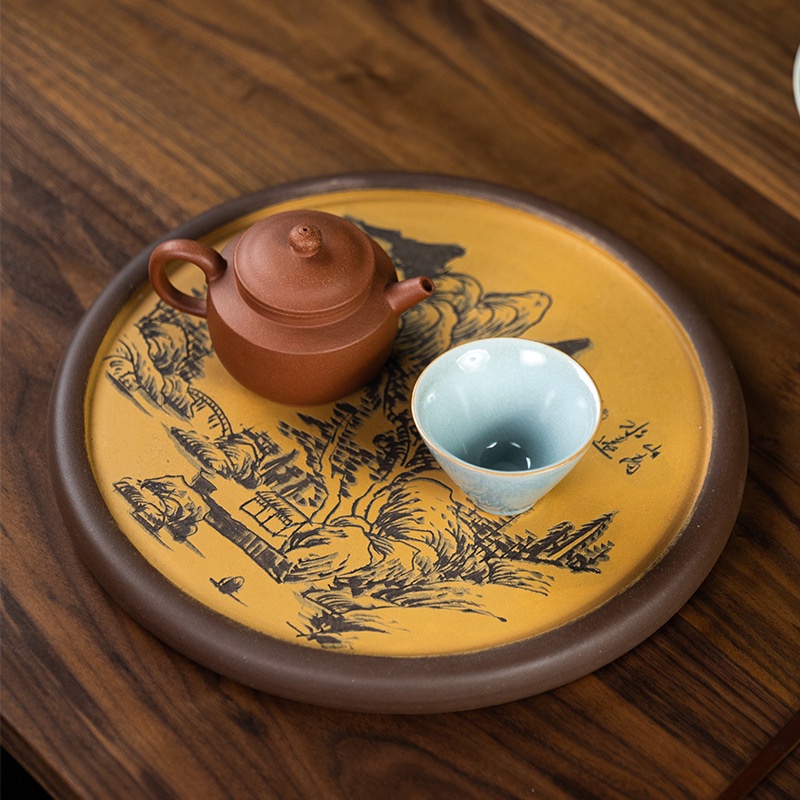 Khay Trà, Thuyền Trà Dưỡng Ấm Tử Sa Đường Kính 26 cmHoa văn : Khắc Chìm Họa Tiết Sơn Thủy