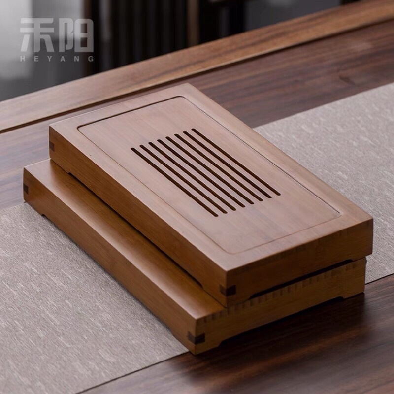 Giới thiệu Khay trà Tre có khay nhựa hứng nước.