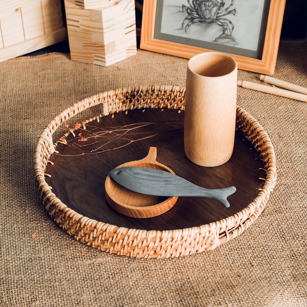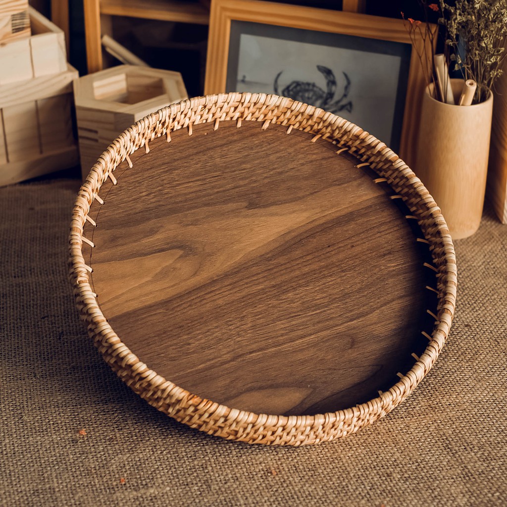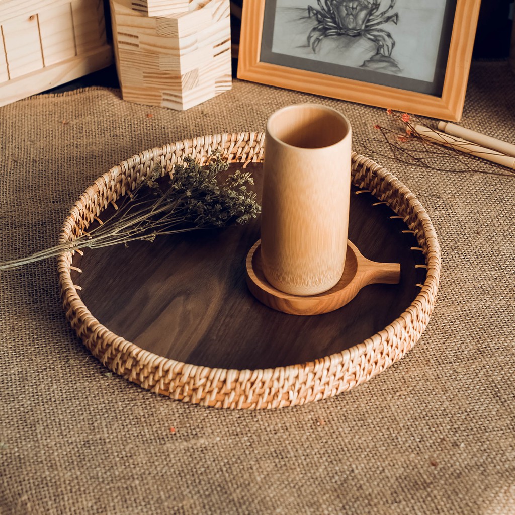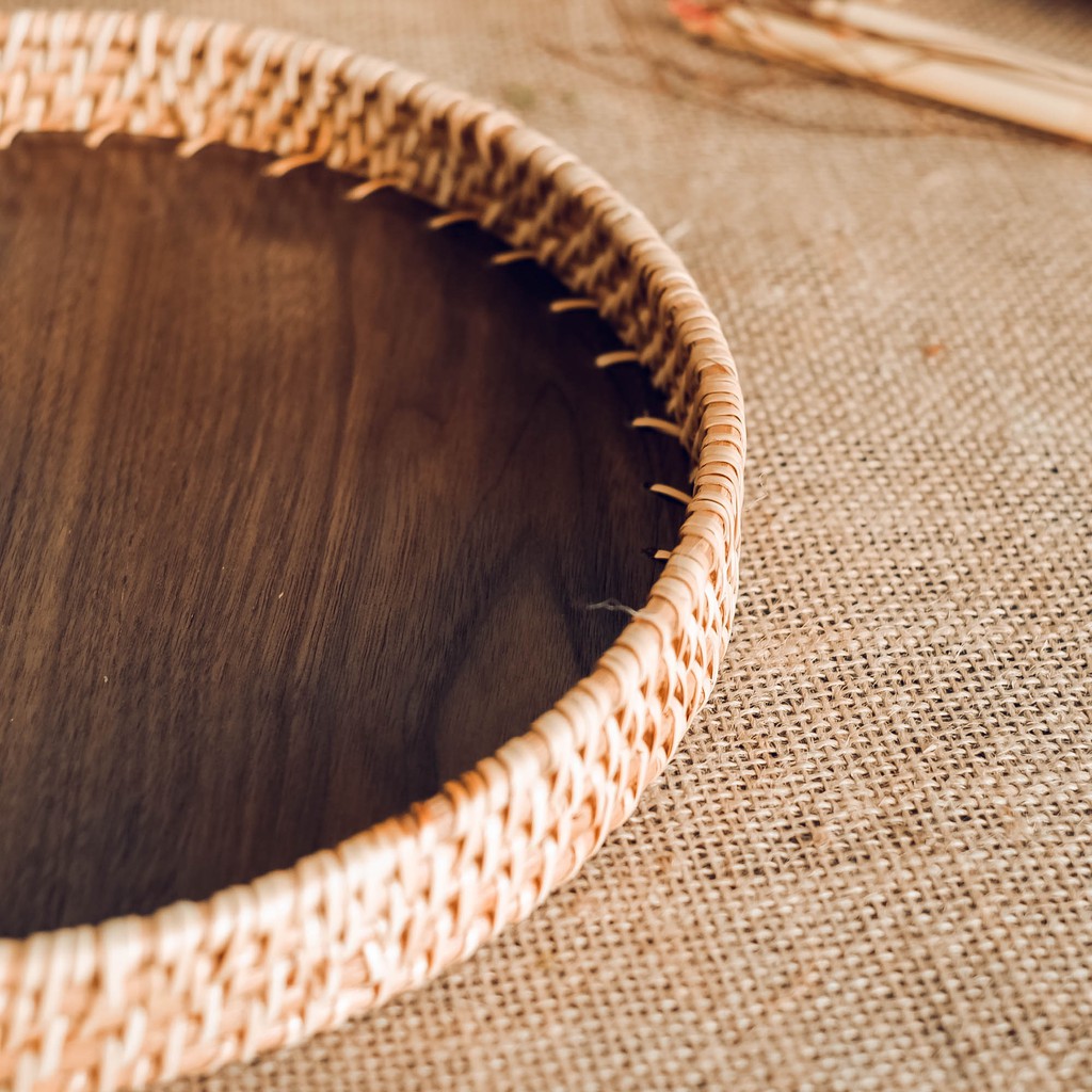 Khay tròn mây đế gỗ veneer- Được sản xuất từ mây kết hợp đế bằng gỗ vân veneer, trọng lượng nhẹ, bền, mộc mạc.
