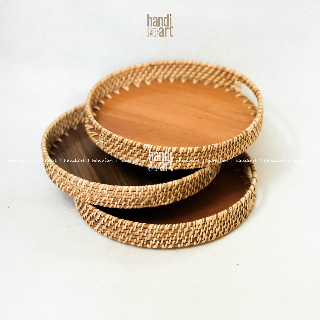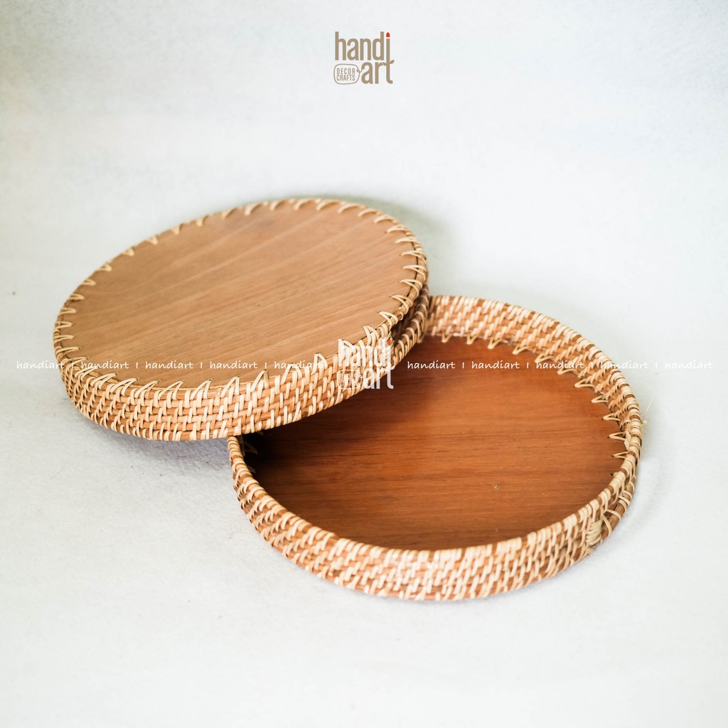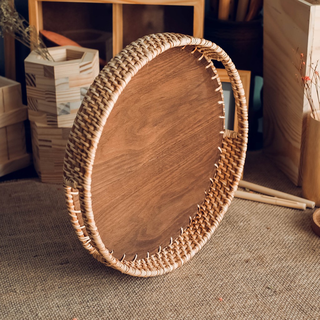 Khay tròn có quai bằng mây đế gỗ - Khay mây tròn-Wooden tea tray