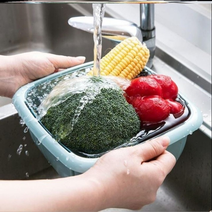 Rổ nhựa có 2 lớp giúp rau củ nhanh ráo nước mà không giỏ nước ra ngoài.